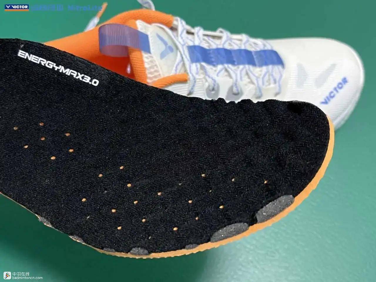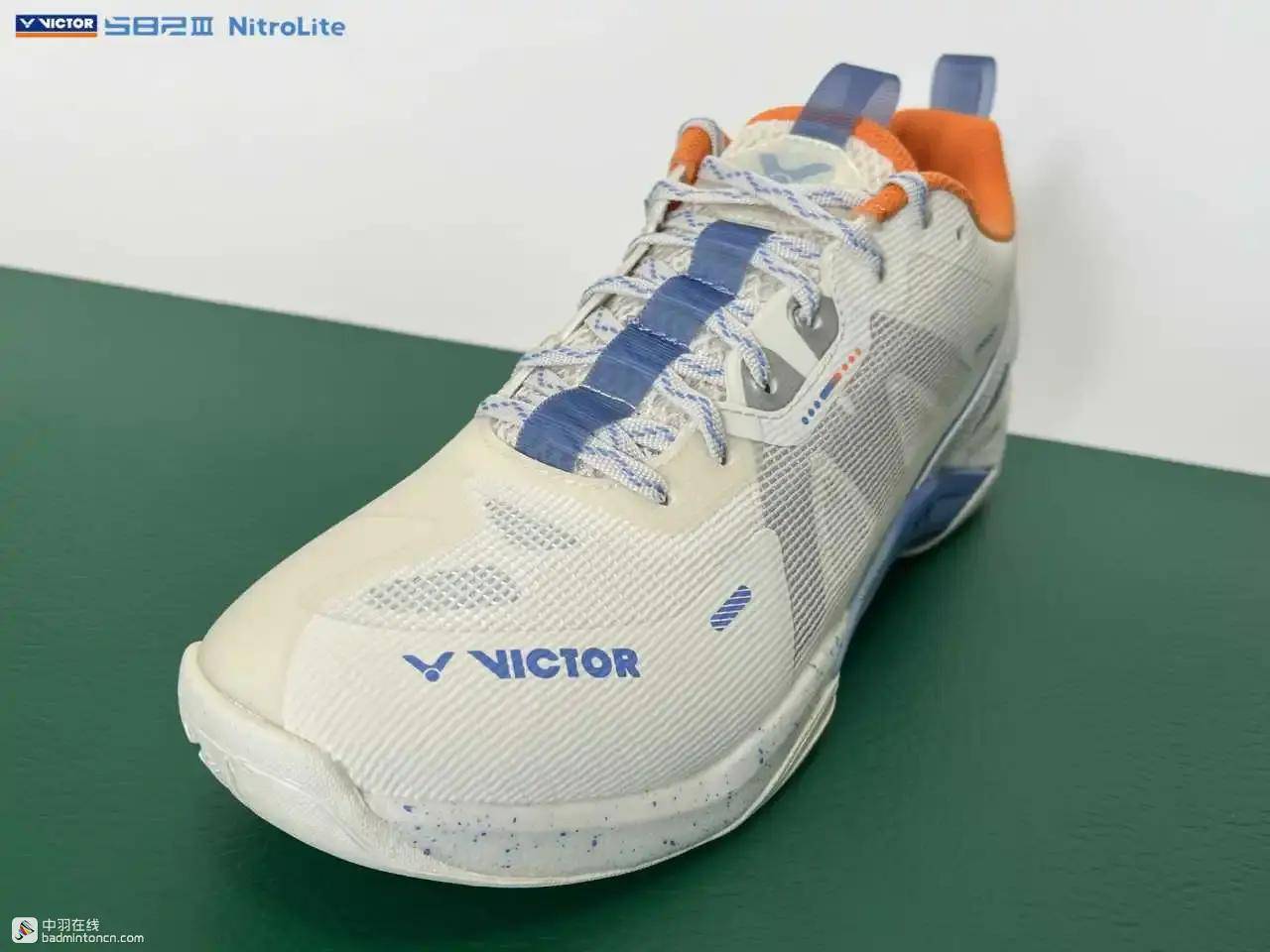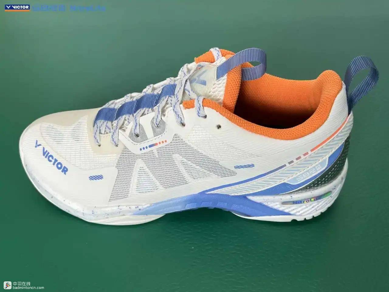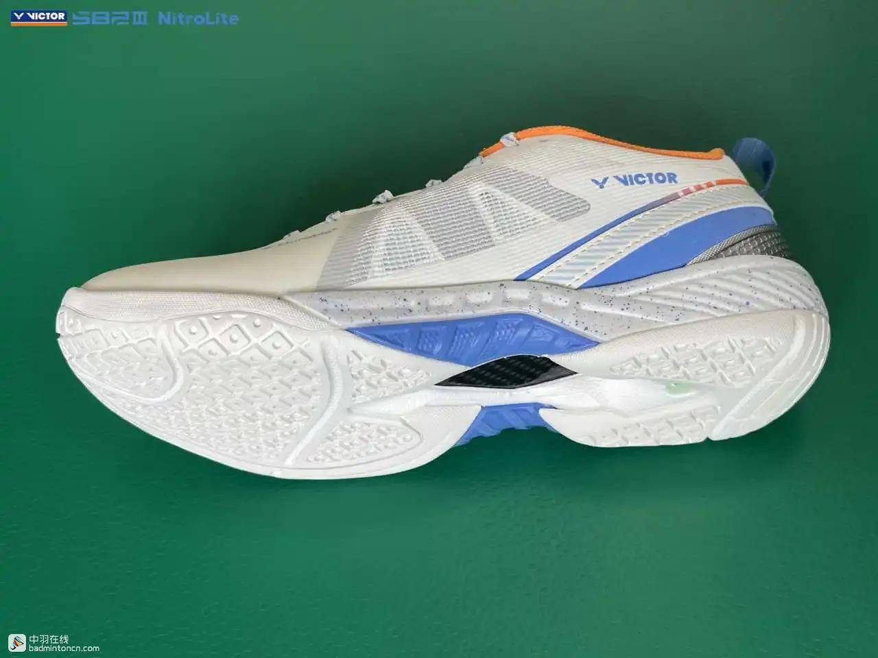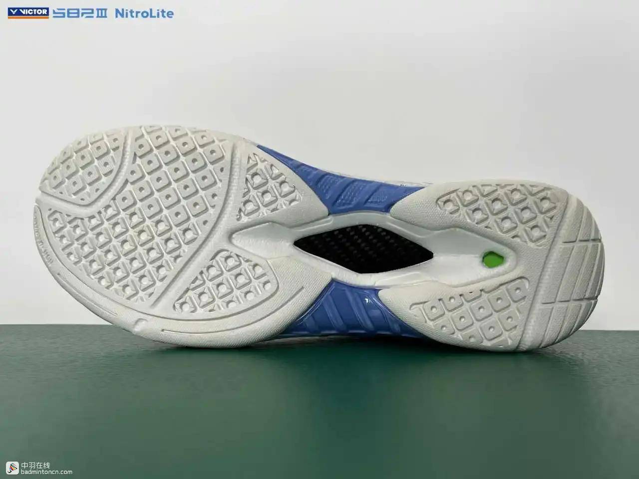 在鞋头外侧的白色TPU薄膜上,蓝色的威克多LOGO和品牌名称、以及蓝色斜条纹图案非常醒目,和S82 Ⅲ的设计相同。