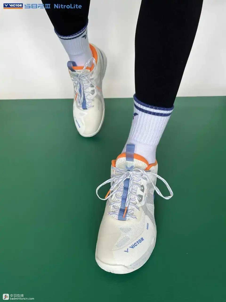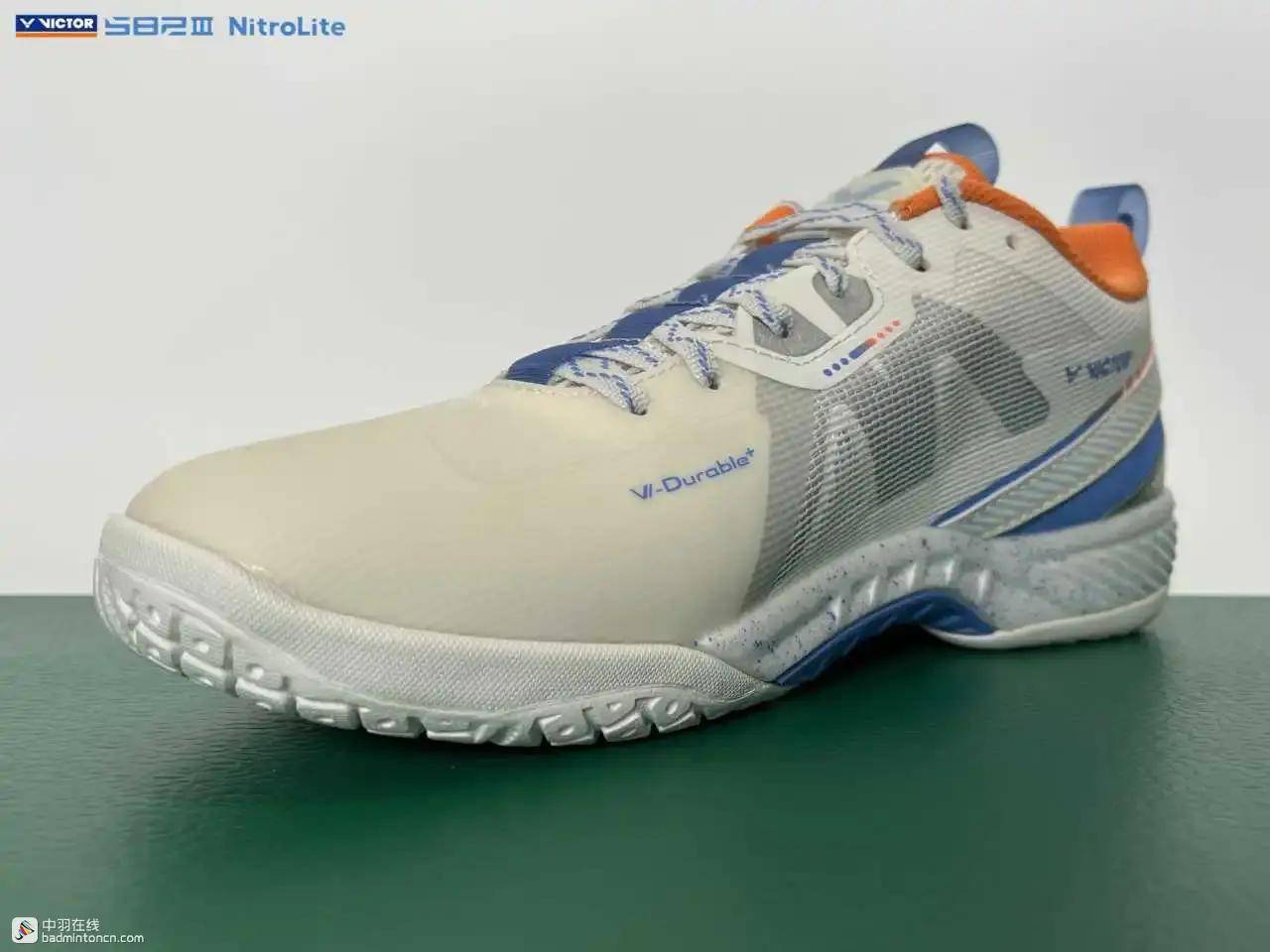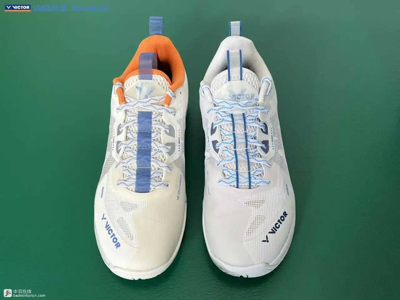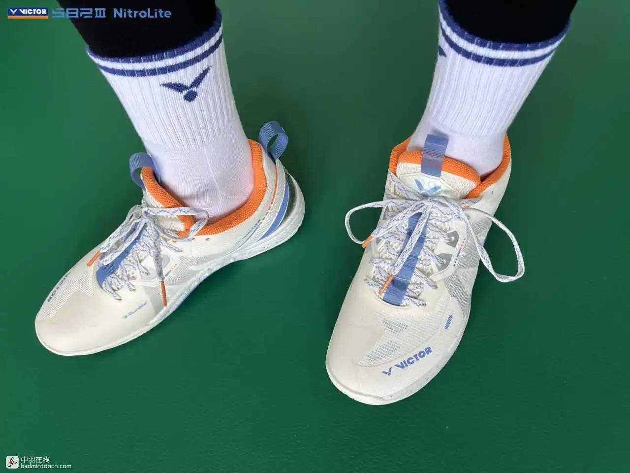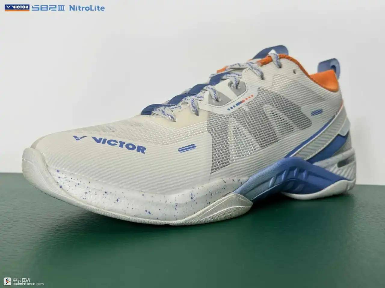 在鞋头外侧的白色TPU薄膜上,蓝色的威克多LOGO和品牌名称、以及蓝色斜条纹图案非常醒目,和S82 Ⅲ的设计相同。