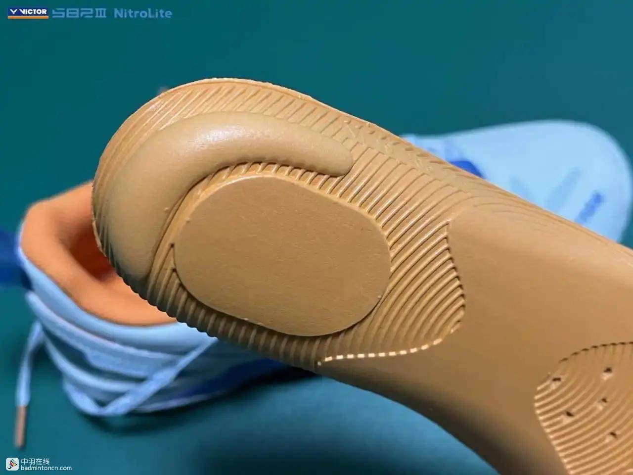 此外,外侧TPU的加持令S82 Ⅲ NitroLite延续了前代的防侧翻性能,在大幅度步伐相对较少的双打中是完全能够胜任的;在单打中,对于部分体重较大或者步伐较重、蹬力比较强的球友来说,在正手底线被动跨步等需要弓箭步落地支撑的步法中,鞋外侧面抗冲击的能力还是会弱于A970ACE等全面类球鞋。另外,由于S82 Ⅲ NitroLite后跟处相对偏厚而且超临界氮气发泡材料比较柔软,在步伐触地产生较大冲击力时,易发生形变,稳定性稍显逊色。