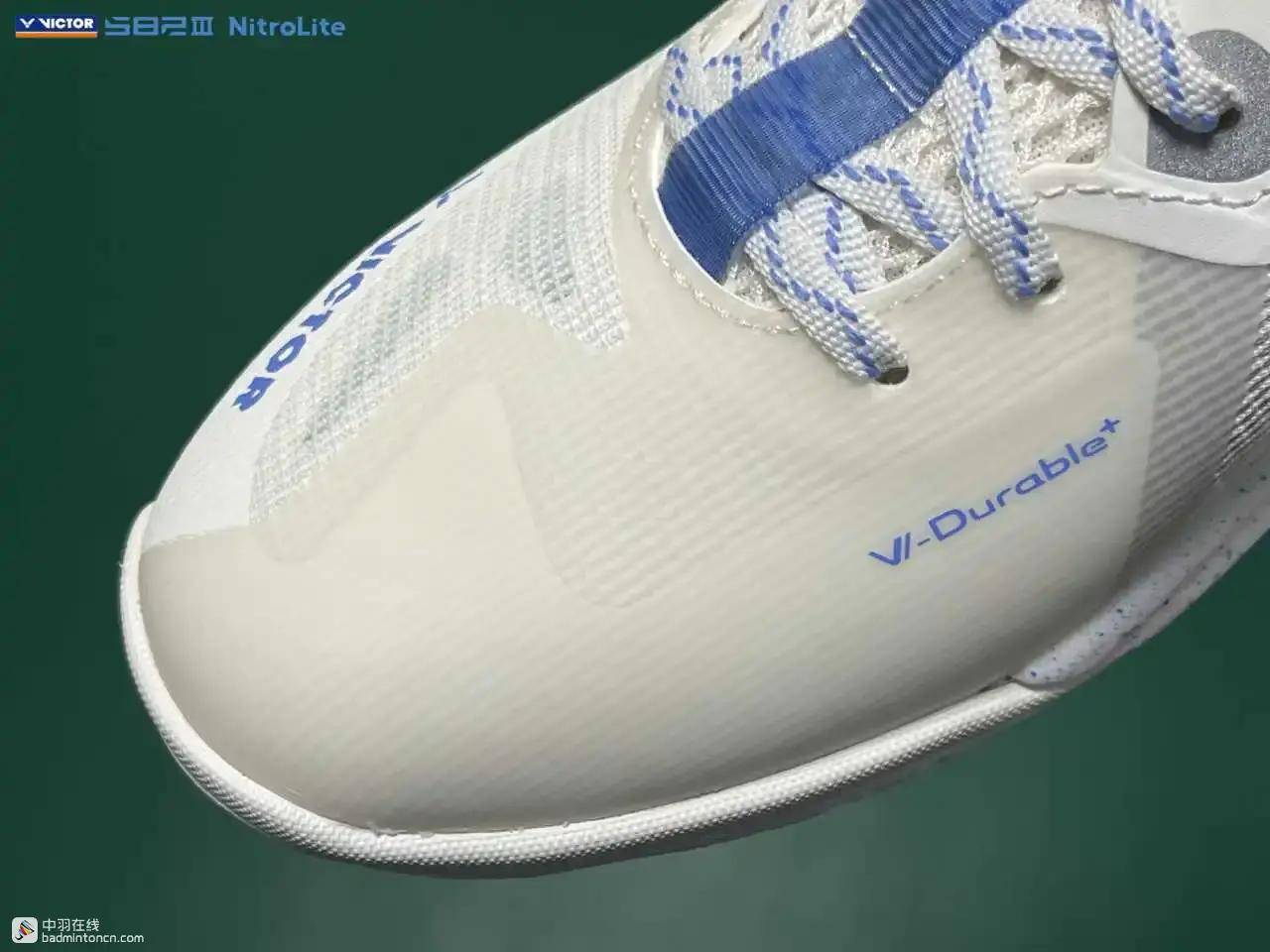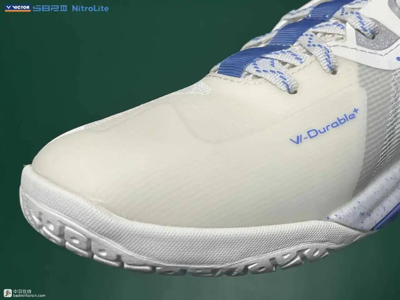 鞋头内侧包覆“V-Durable”耐磨薄膜,适应羽毛球步伐需要,提升球鞋的耐磨性。
