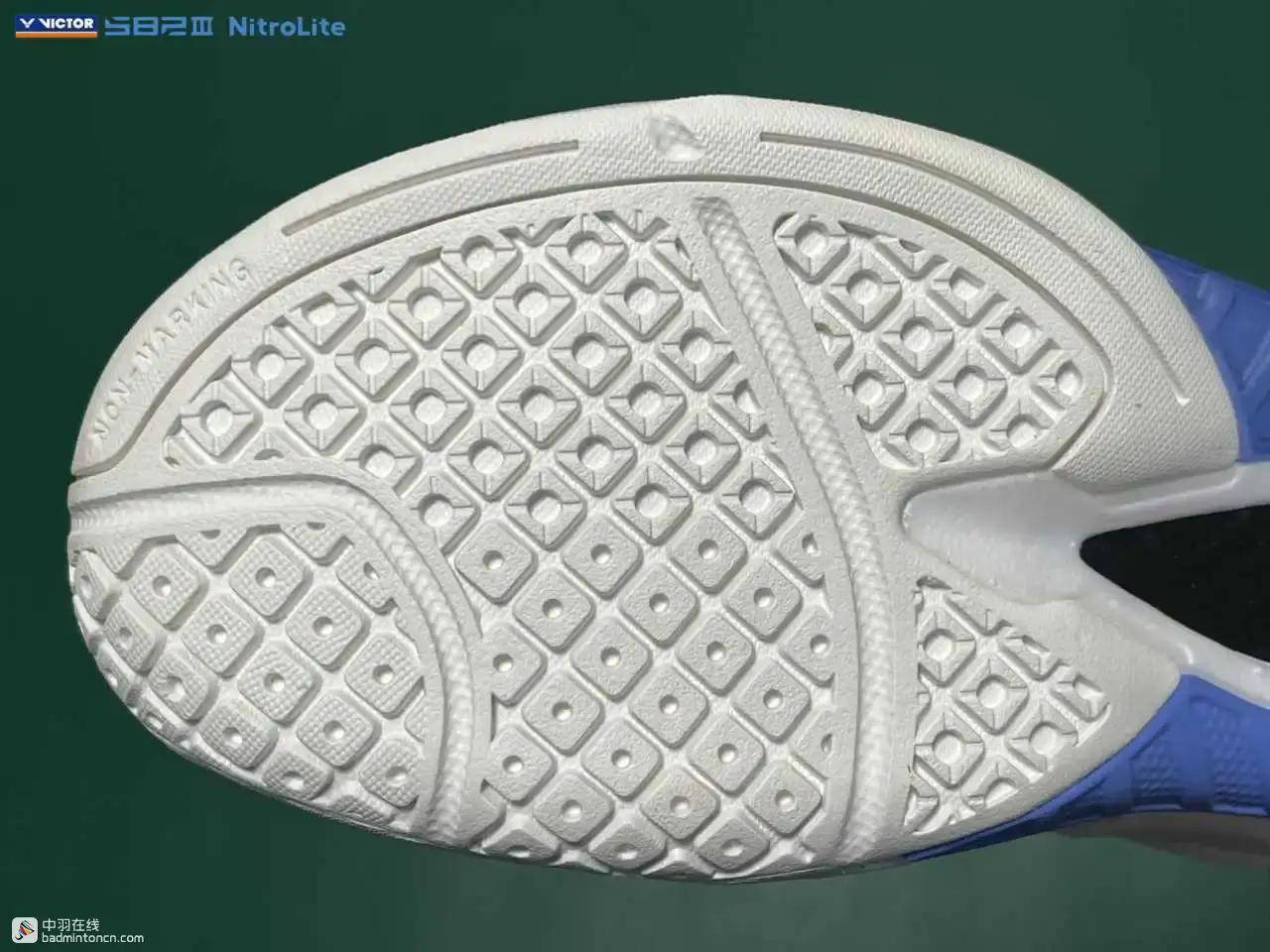 S82 Ⅲ NitroLite的大底延续了S82 Ⅲ的实色橡胶,前后掌通体白色,中桥两侧以蓝色的TPU相连接,很好地延续了鞋面的色彩搭配。