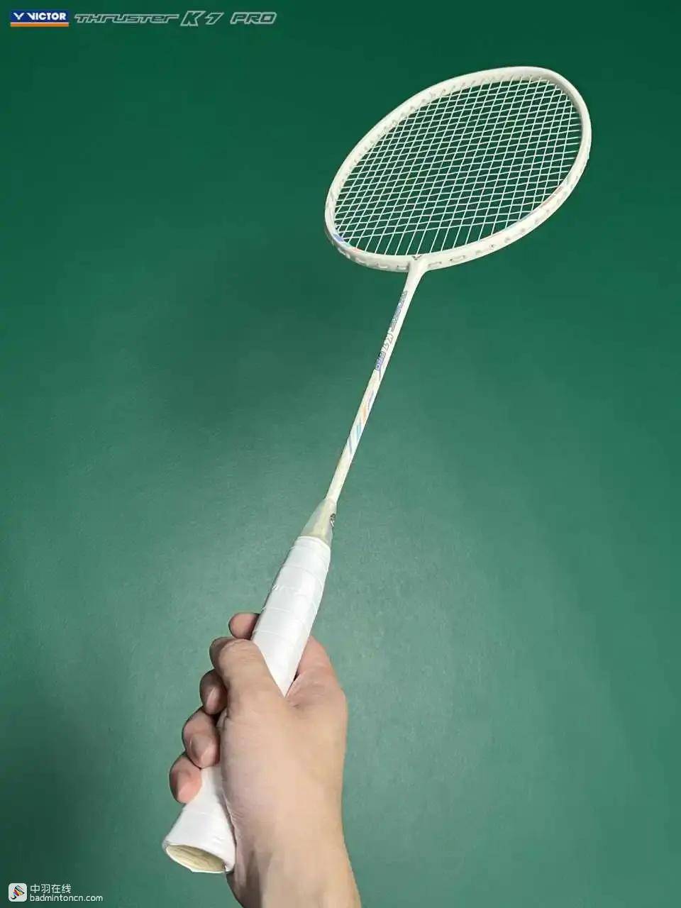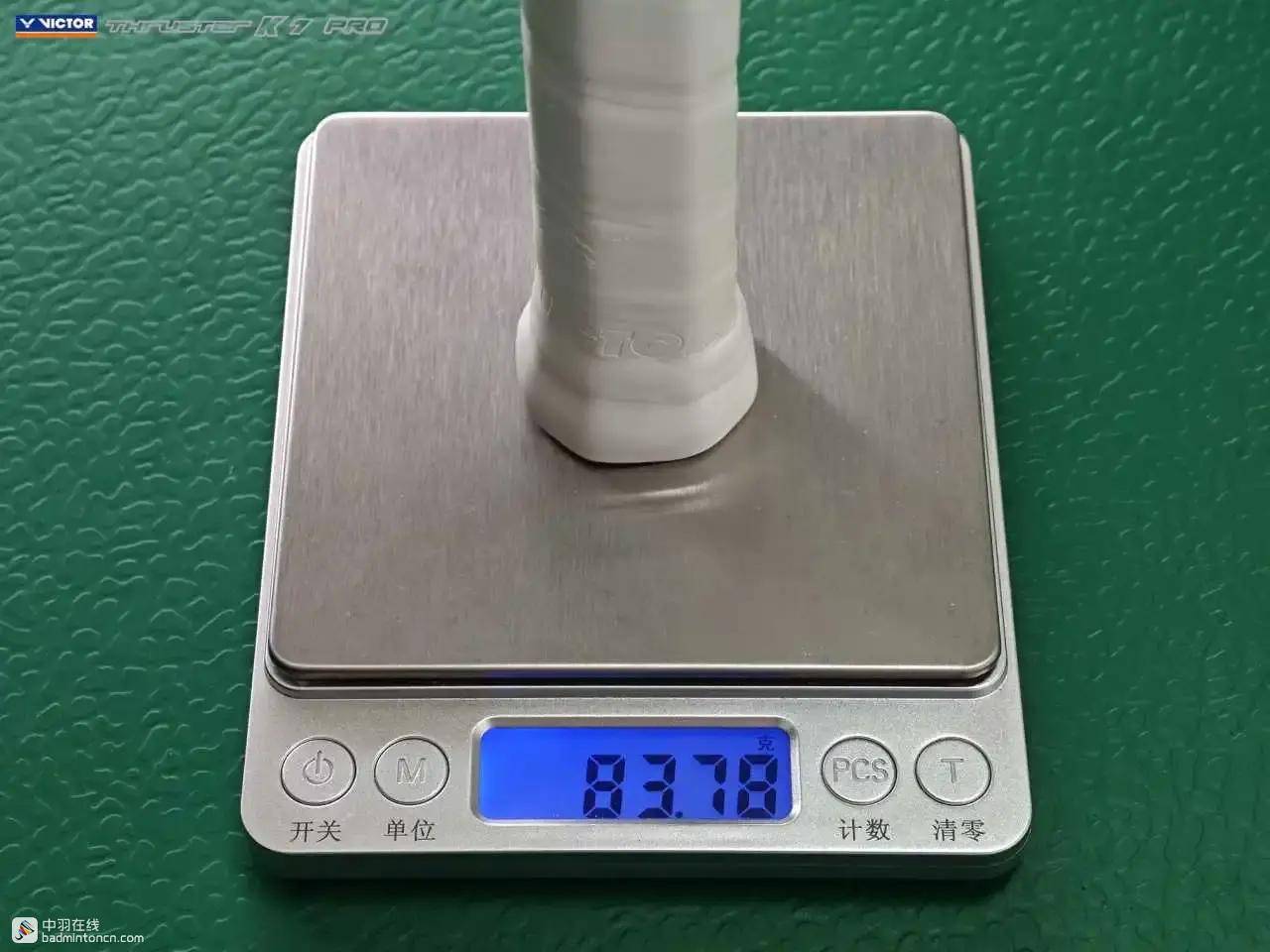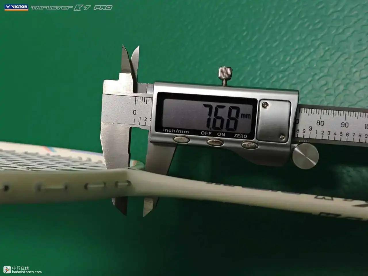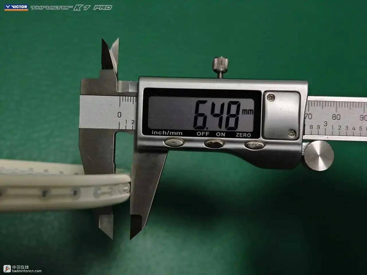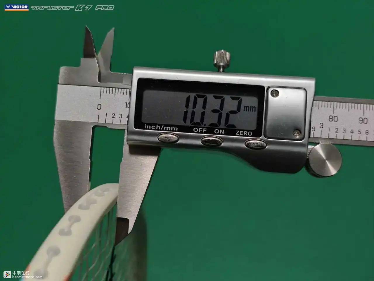 由于受限于球线,使用原装状态的TK-7 PRO A是很难感受到球拍本身的特点的,因此笔者剪去原厂线后重新穿了线(威克多VBS-69N线),考虑到是入门级球拍,因此磅数没有穿得太高,选择了24磅。最终在使用状态下TK-7 PRO A的平衡点在307mm左右,略低于相同状态下的CHA-9500 PRO,拿在手中没有明显的坠手感。