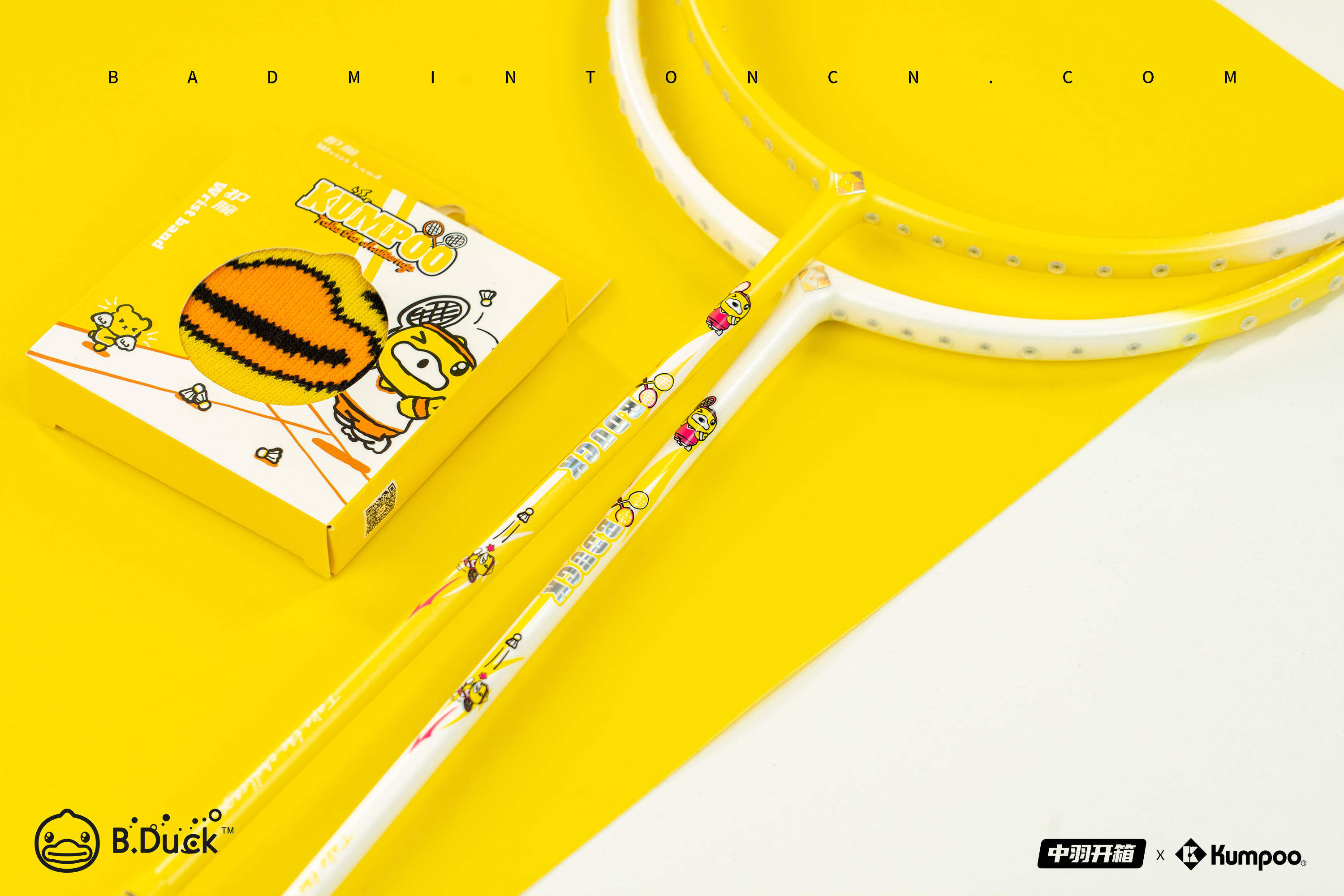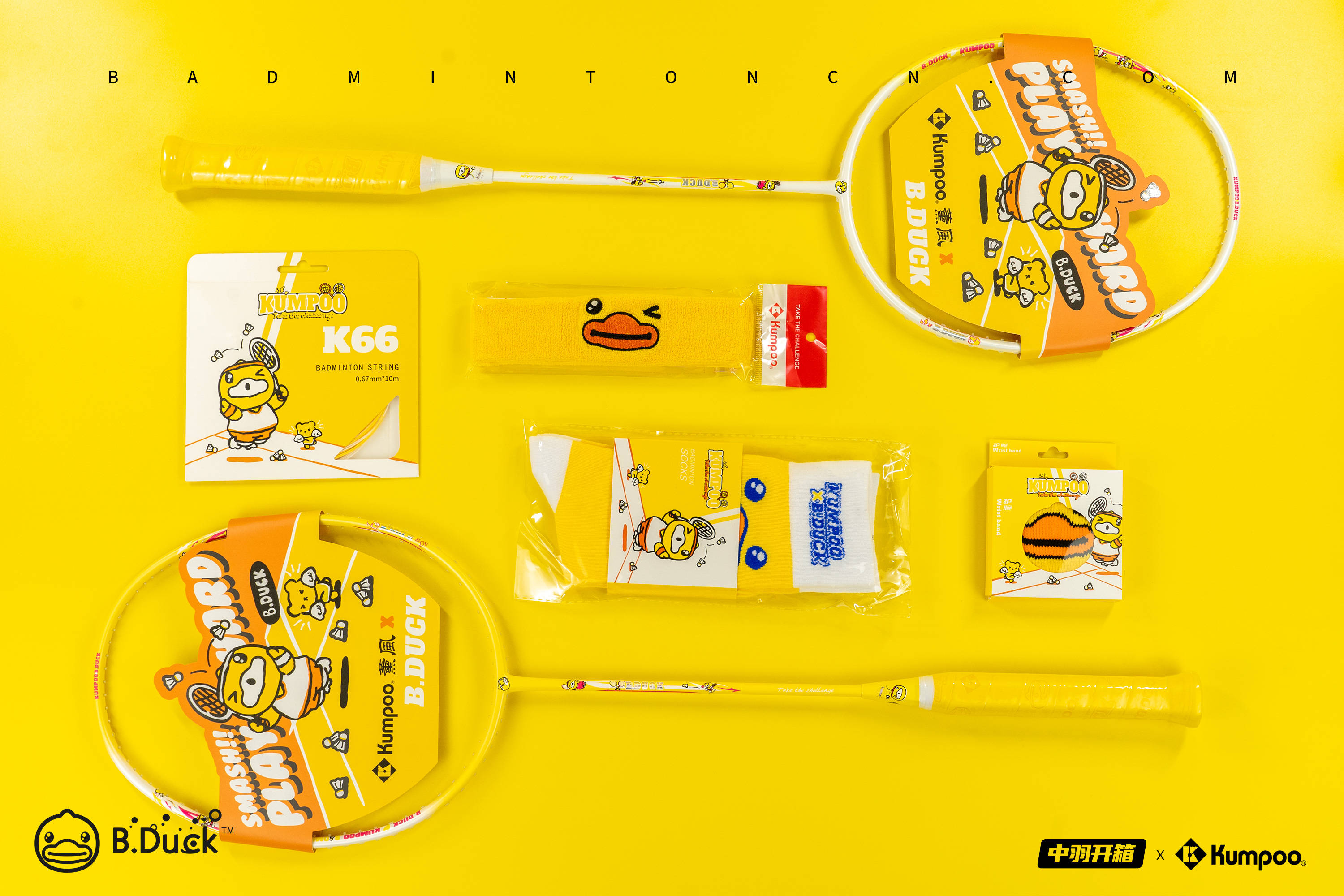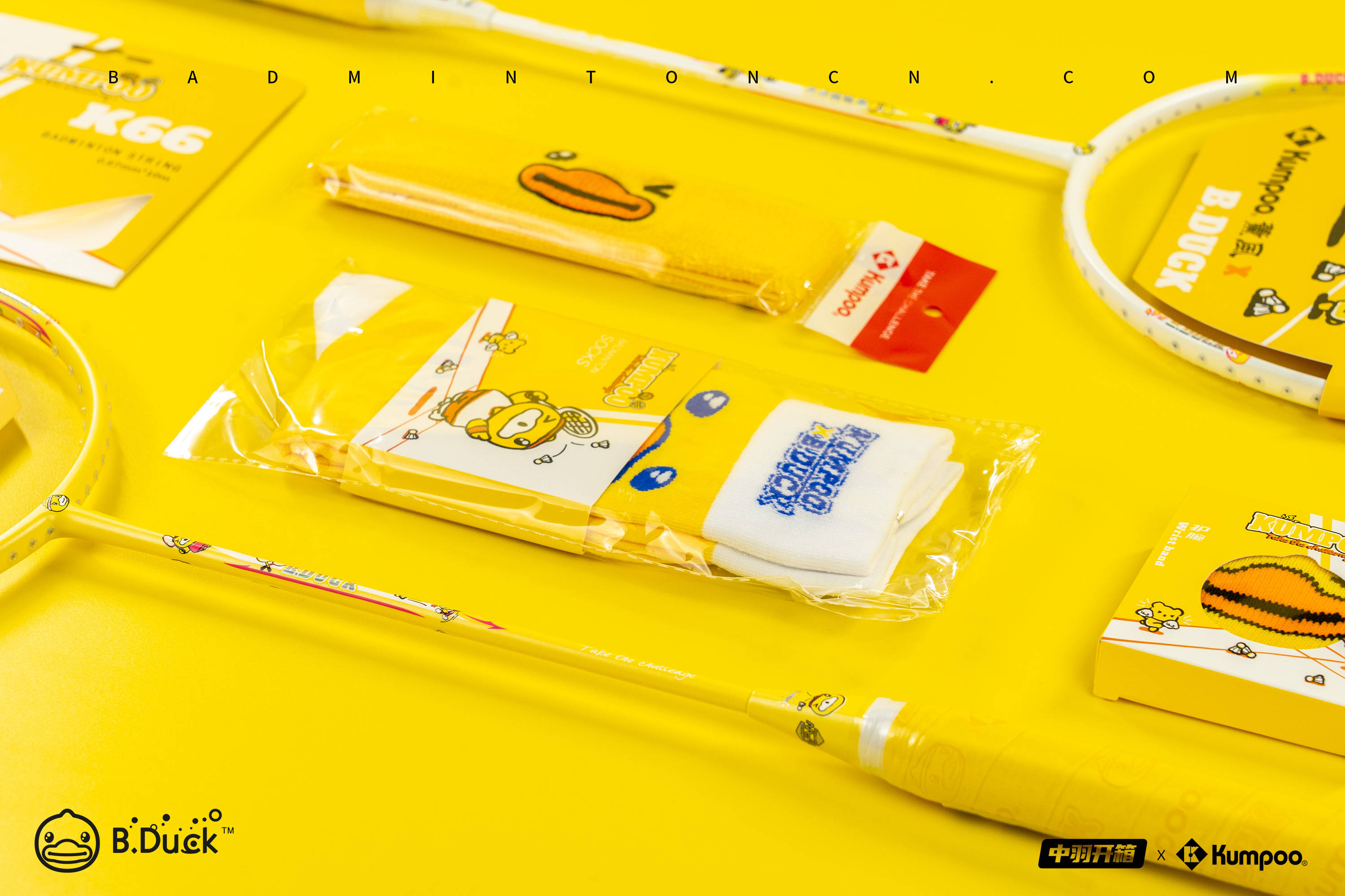 跟随B.Duck联名球拍一同来到中羽开箱的系列产品还包括球袜、球线、止汗带和护腕,这些周边装备大部分以黄色为主,并搭配上B.Duck小黄鸭标志性的橙色喙部,拥有极强的辨识度。
