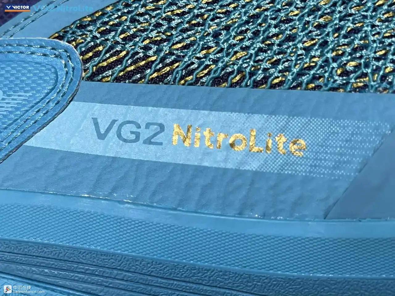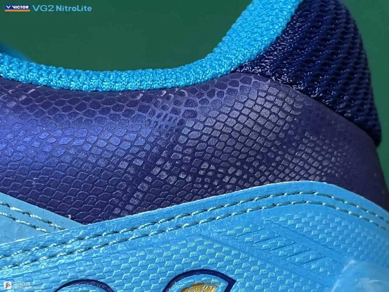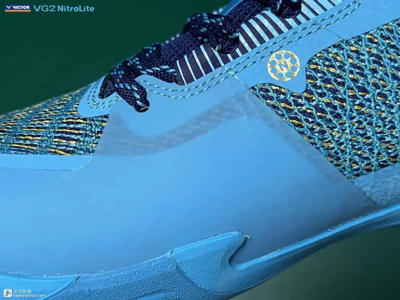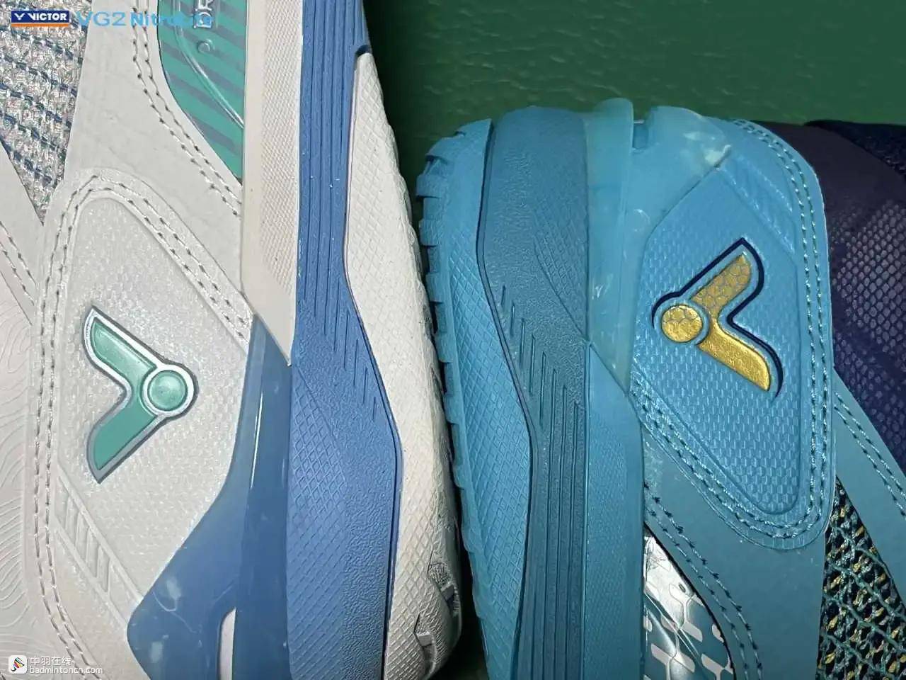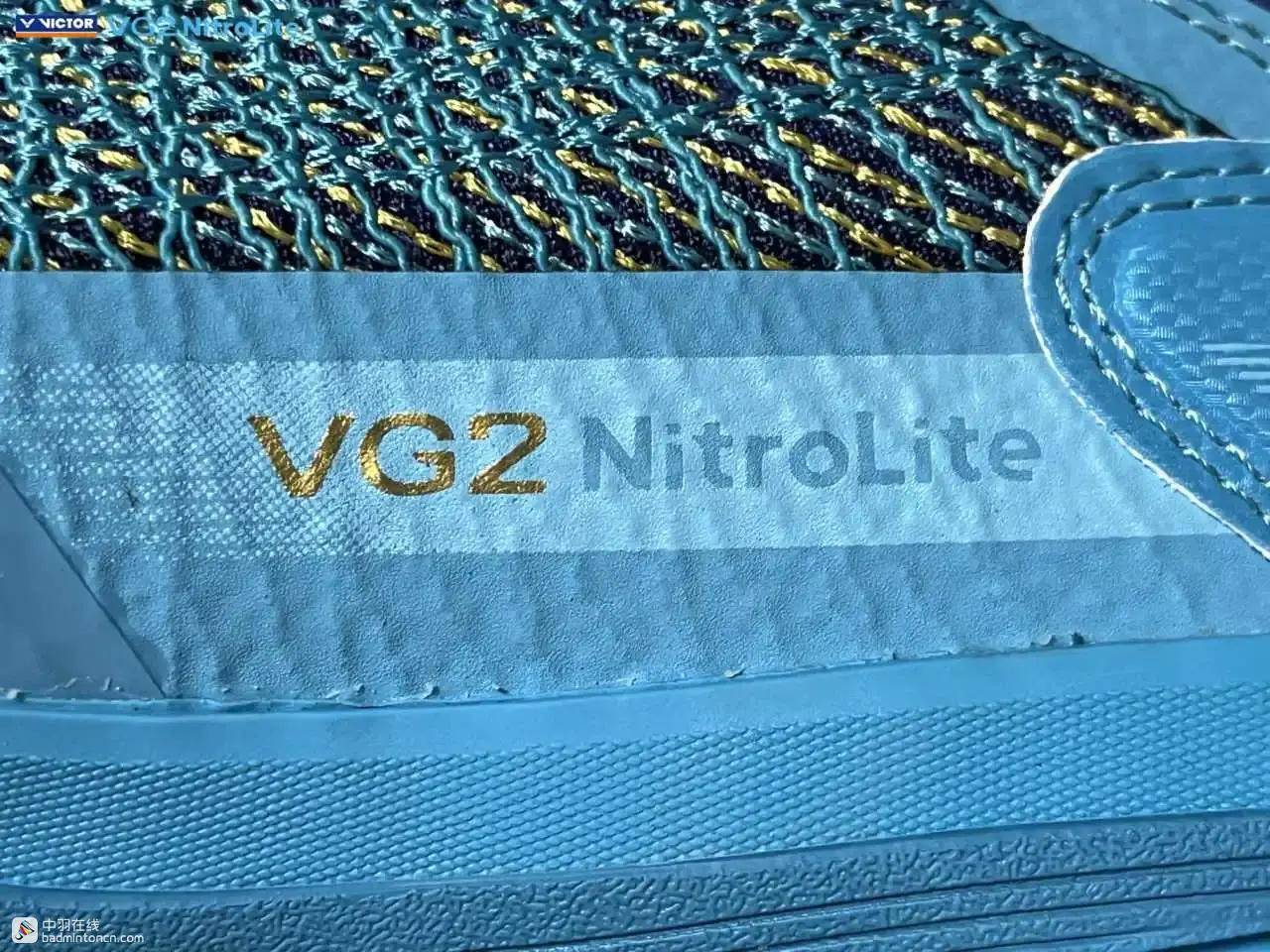 鞋内侧下方的型号名称以蓝金搭配来区分“VG2”和“NitroLite”,且左右脚的颜色是交错的,金对蓝,蓝对金。
