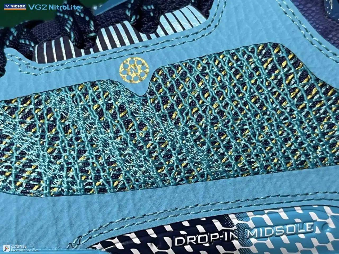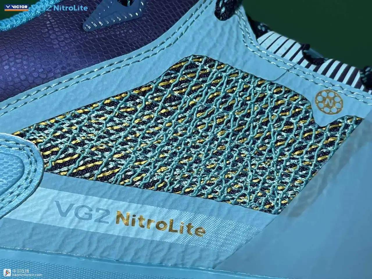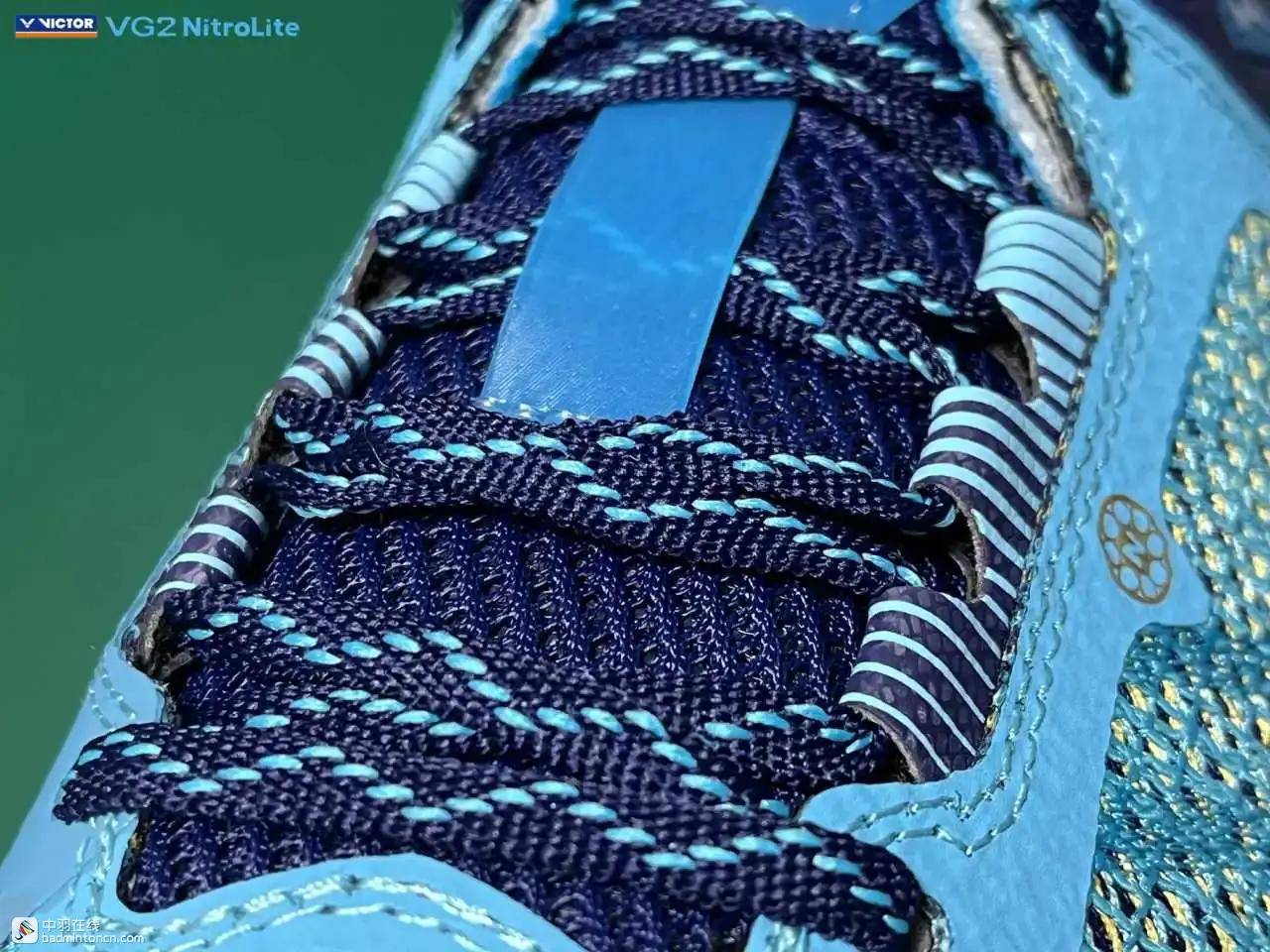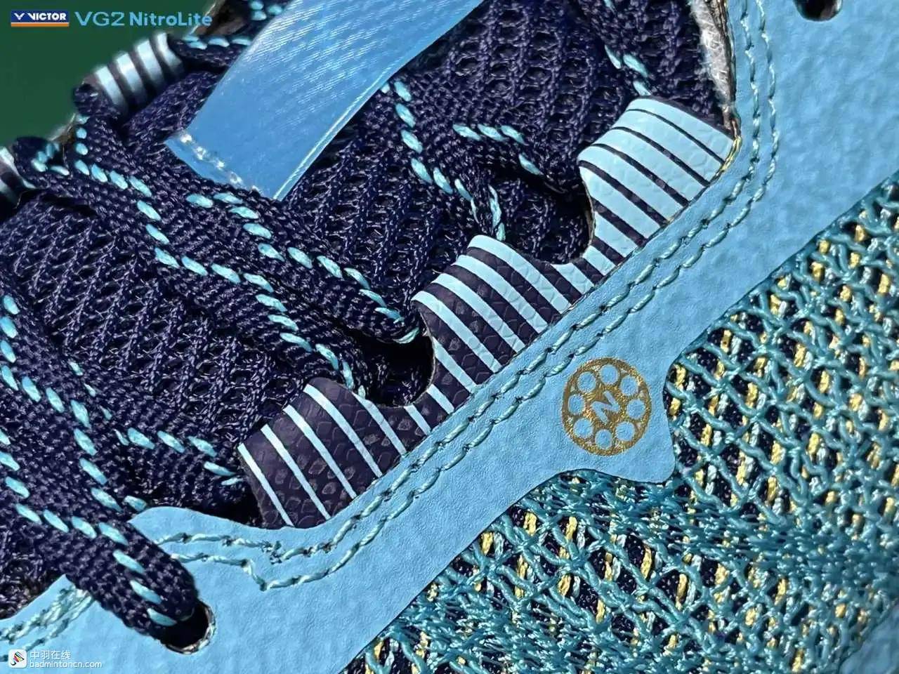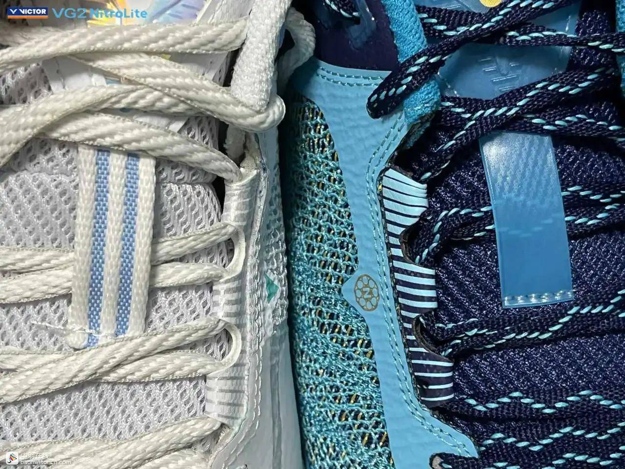 鞋内侧下方的型号名称以蓝金搭配来区分“VG2”和“NitroLite”,且左右脚的颜色是交错的,金对蓝,蓝对金。