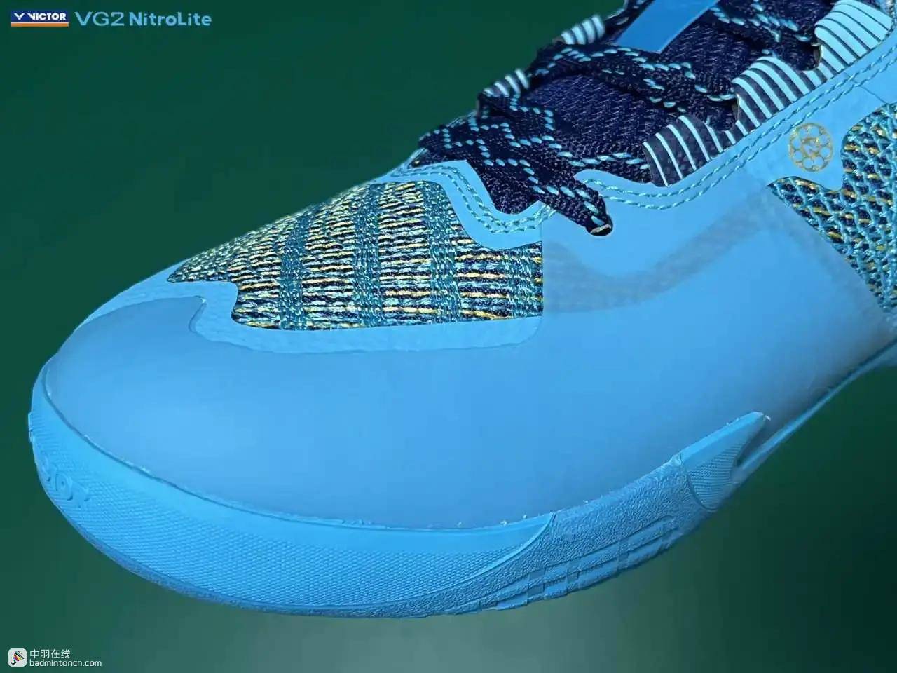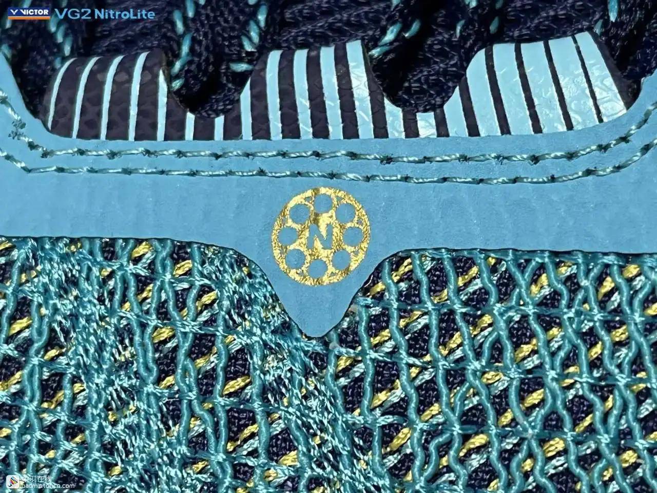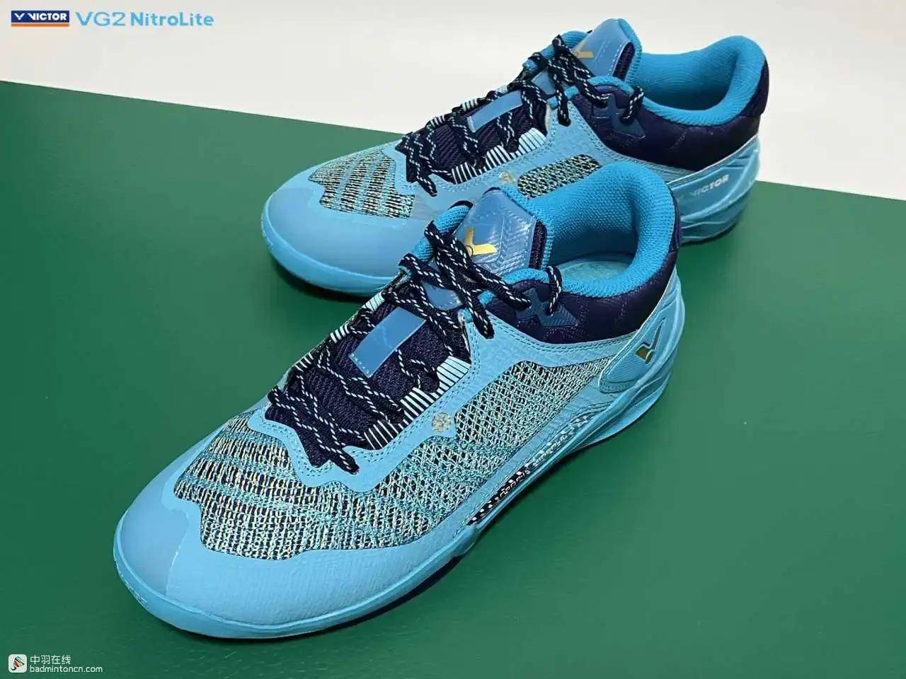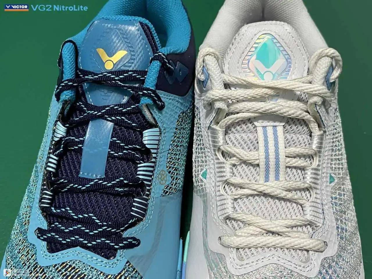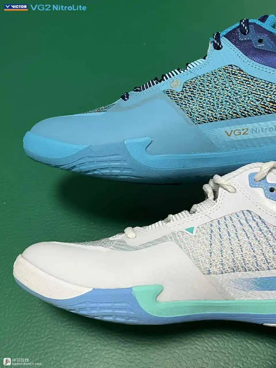 鞋内侧下方的型号名称以蓝金搭配来区分“VG2”和“NitroLite”,且左右脚的颜色是交错的,金对蓝,蓝对金。
