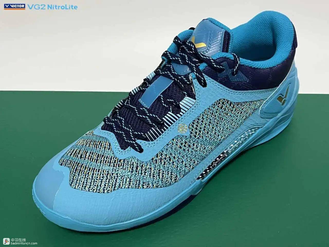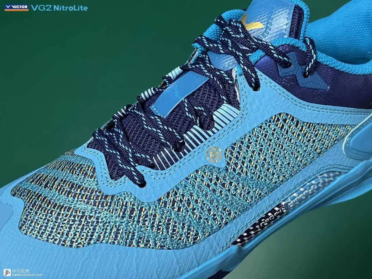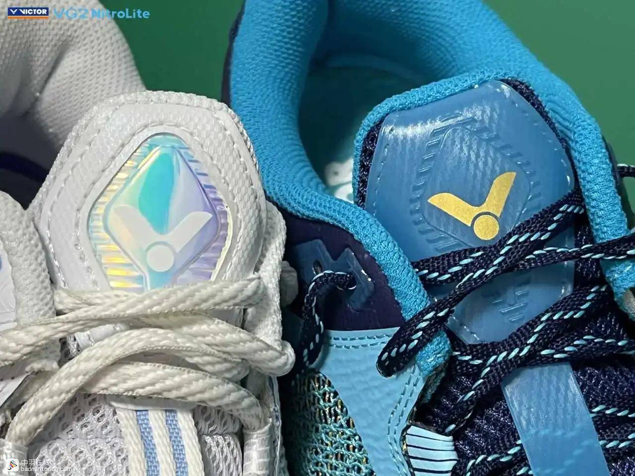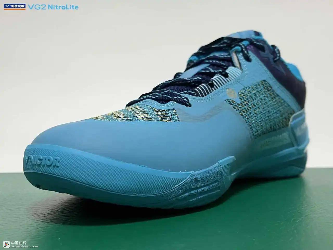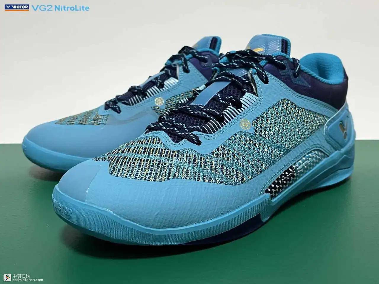鞋内侧下方的型号名称以蓝金搭配来区分“VG2”和“NitroLite”,且左右脚的颜色是交错的,金对蓝,蓝对金。