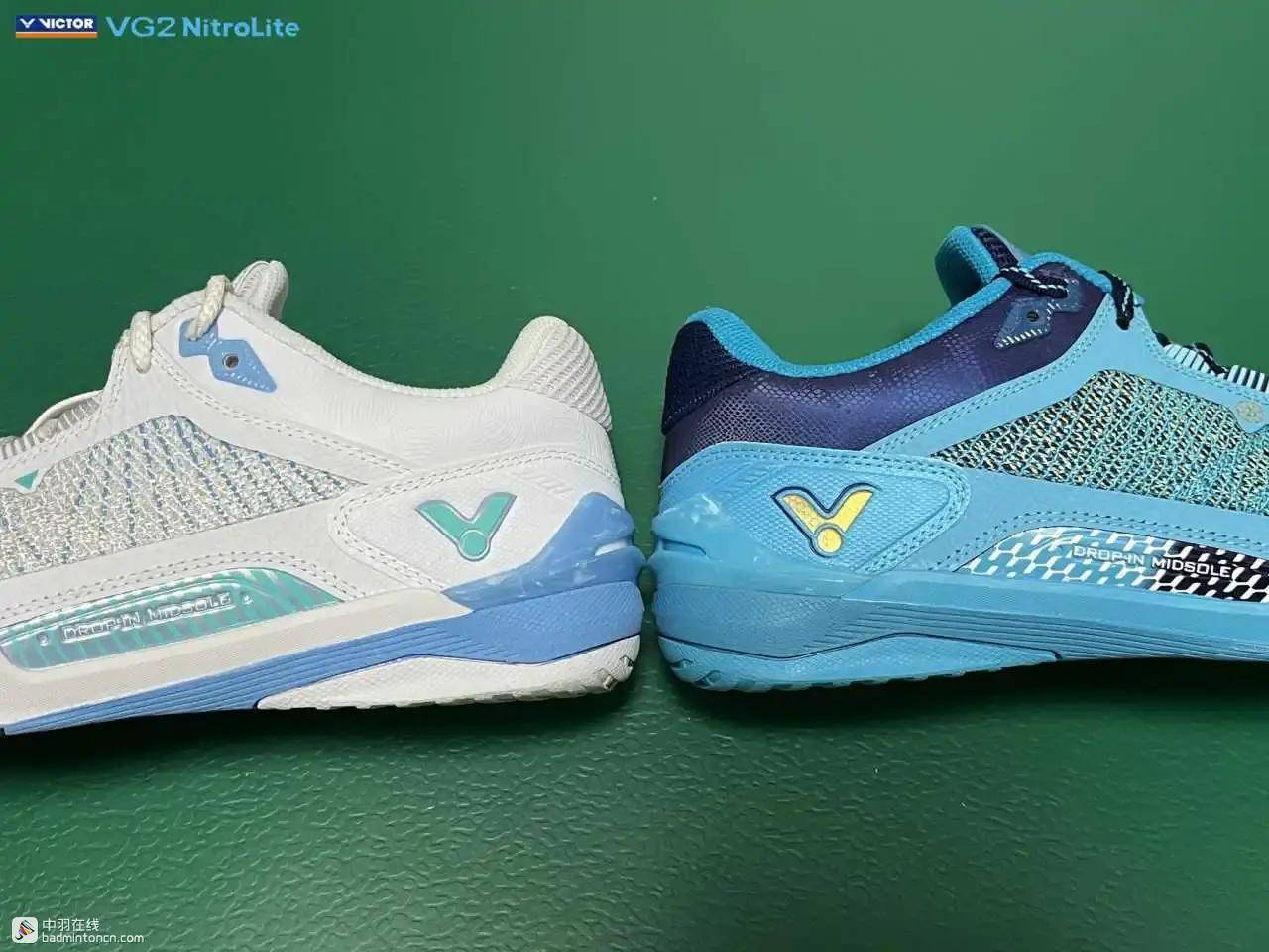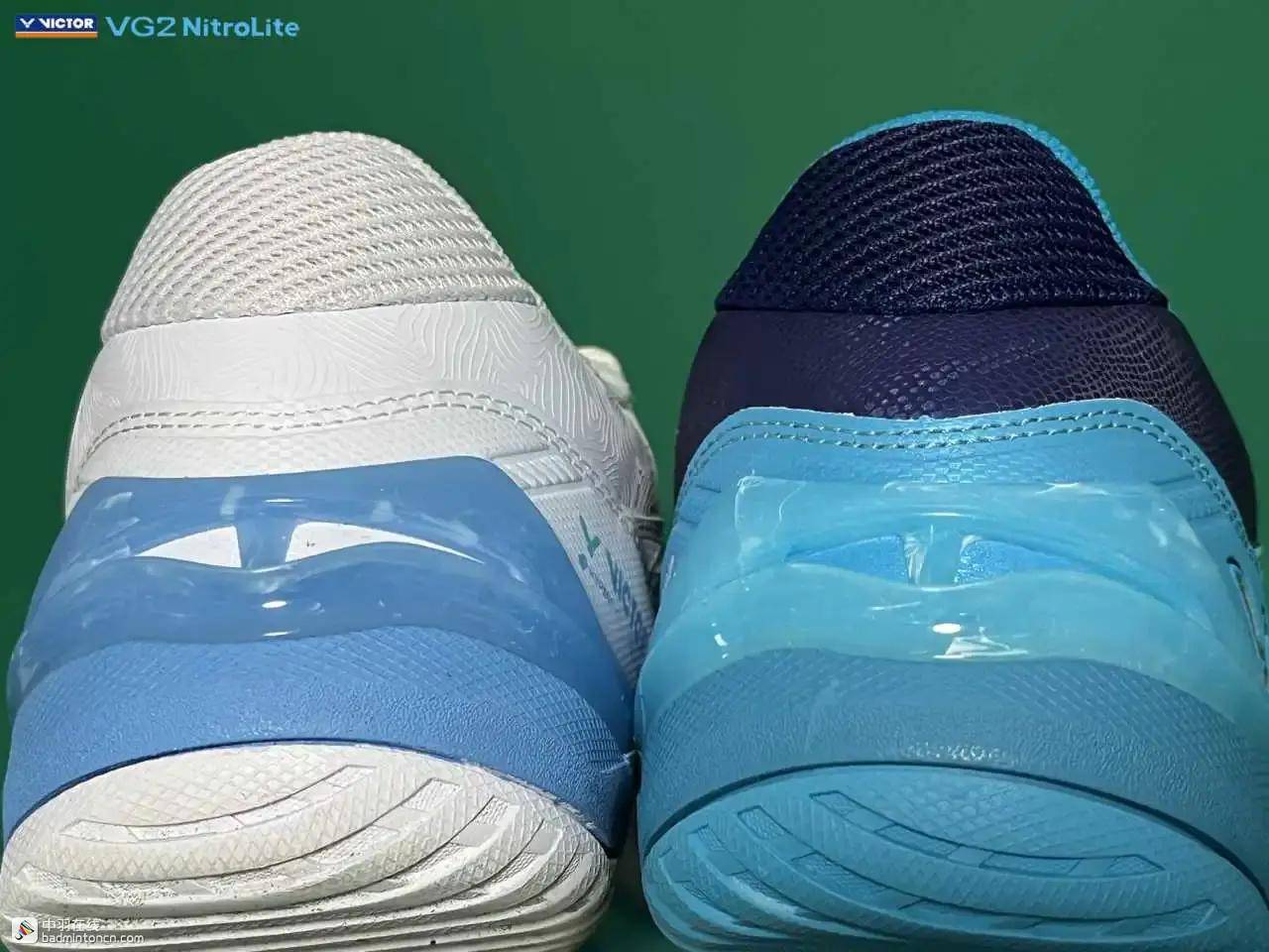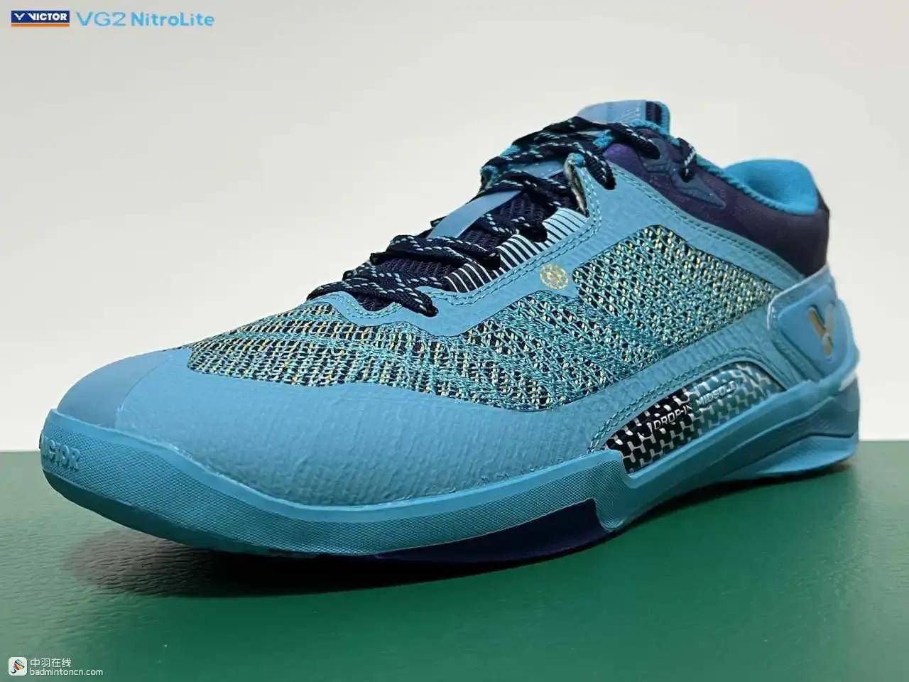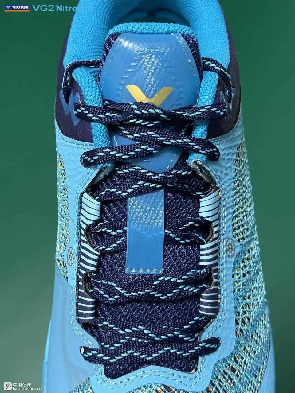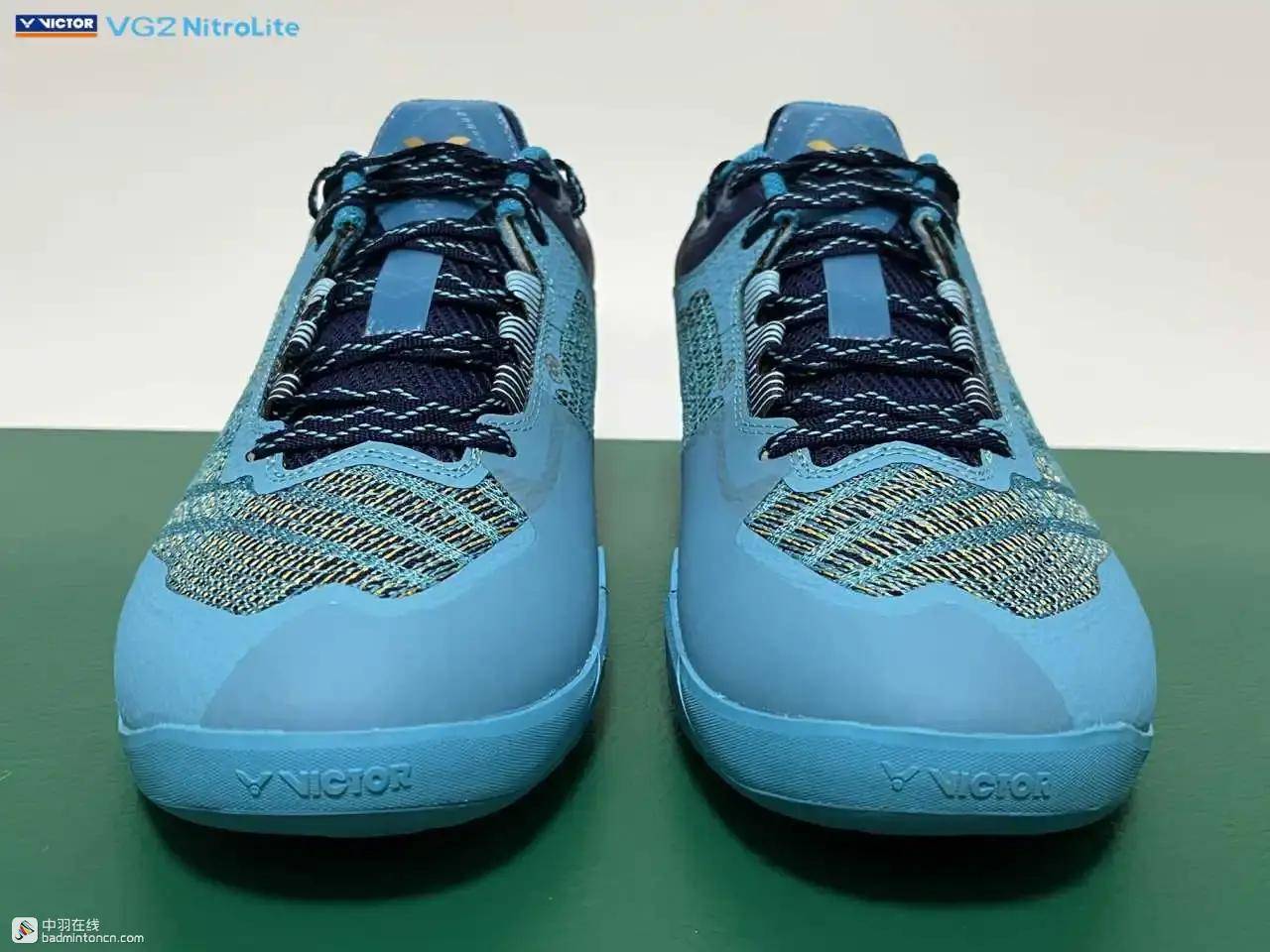 鞋内侧下方的型号名称以蓝金搭配来区分“VG2”和“NitroLite”,且左右脚的颜色是交错的,金对蓝,蓝对金。