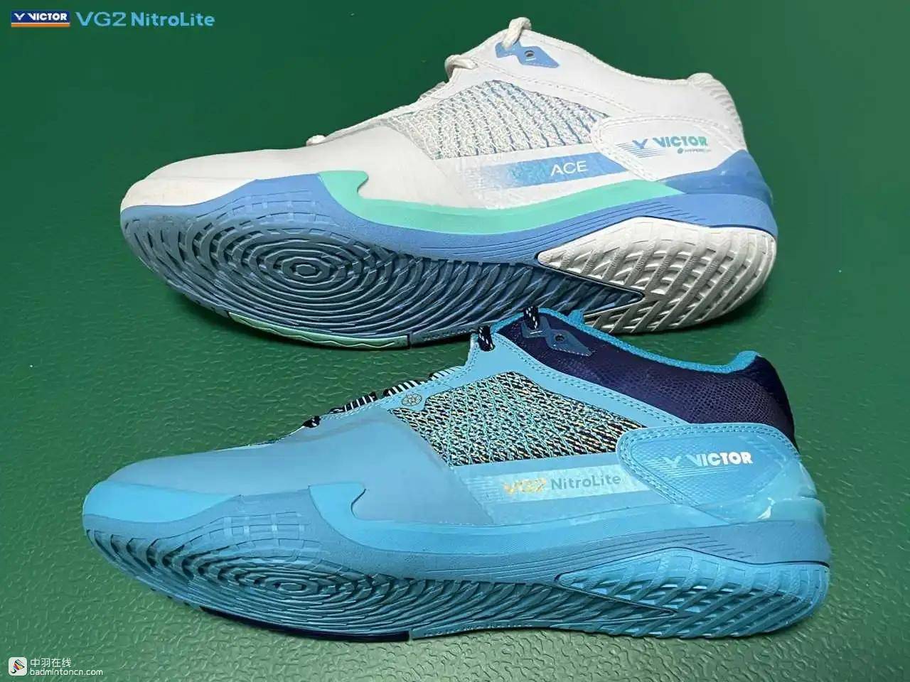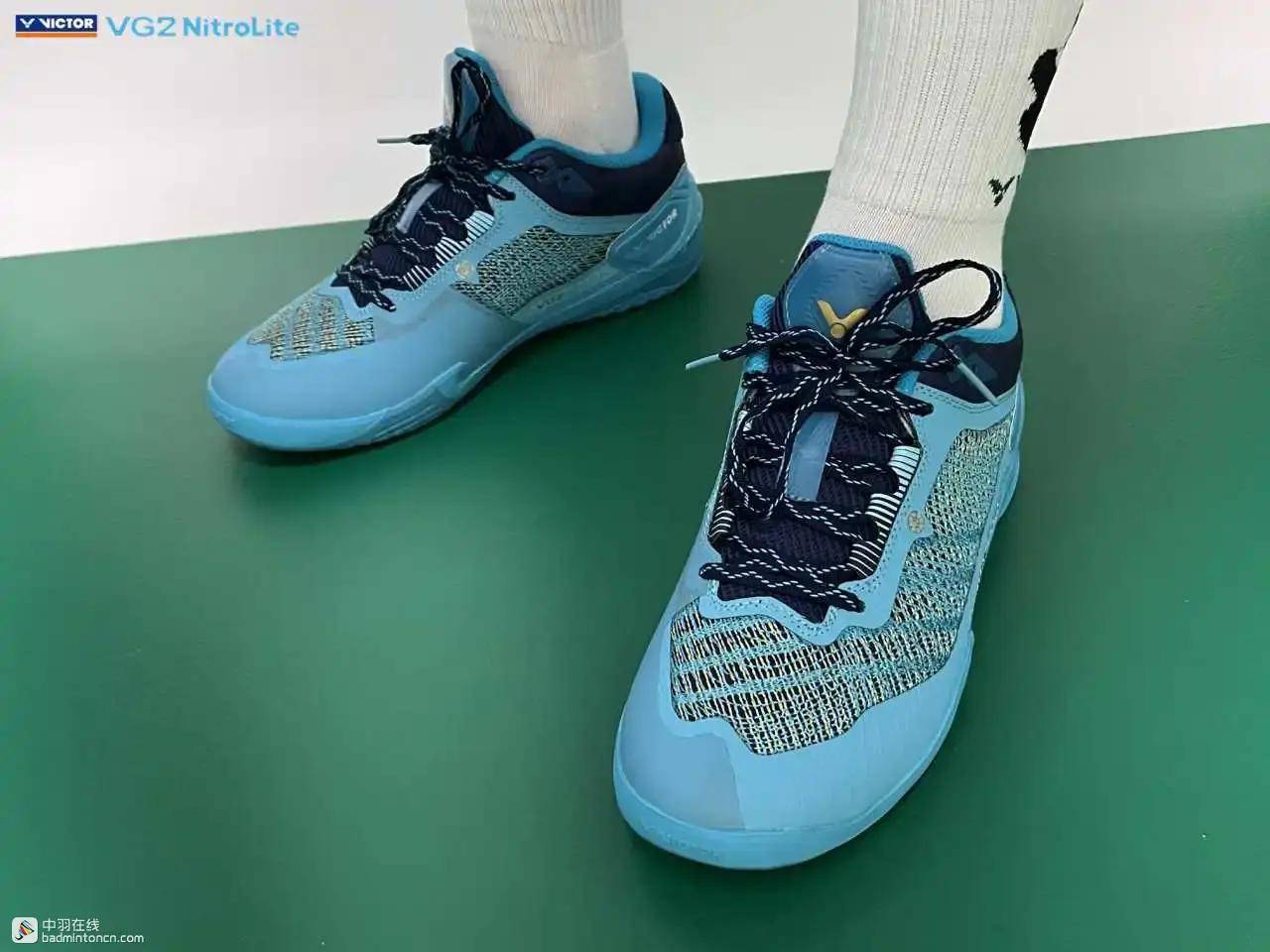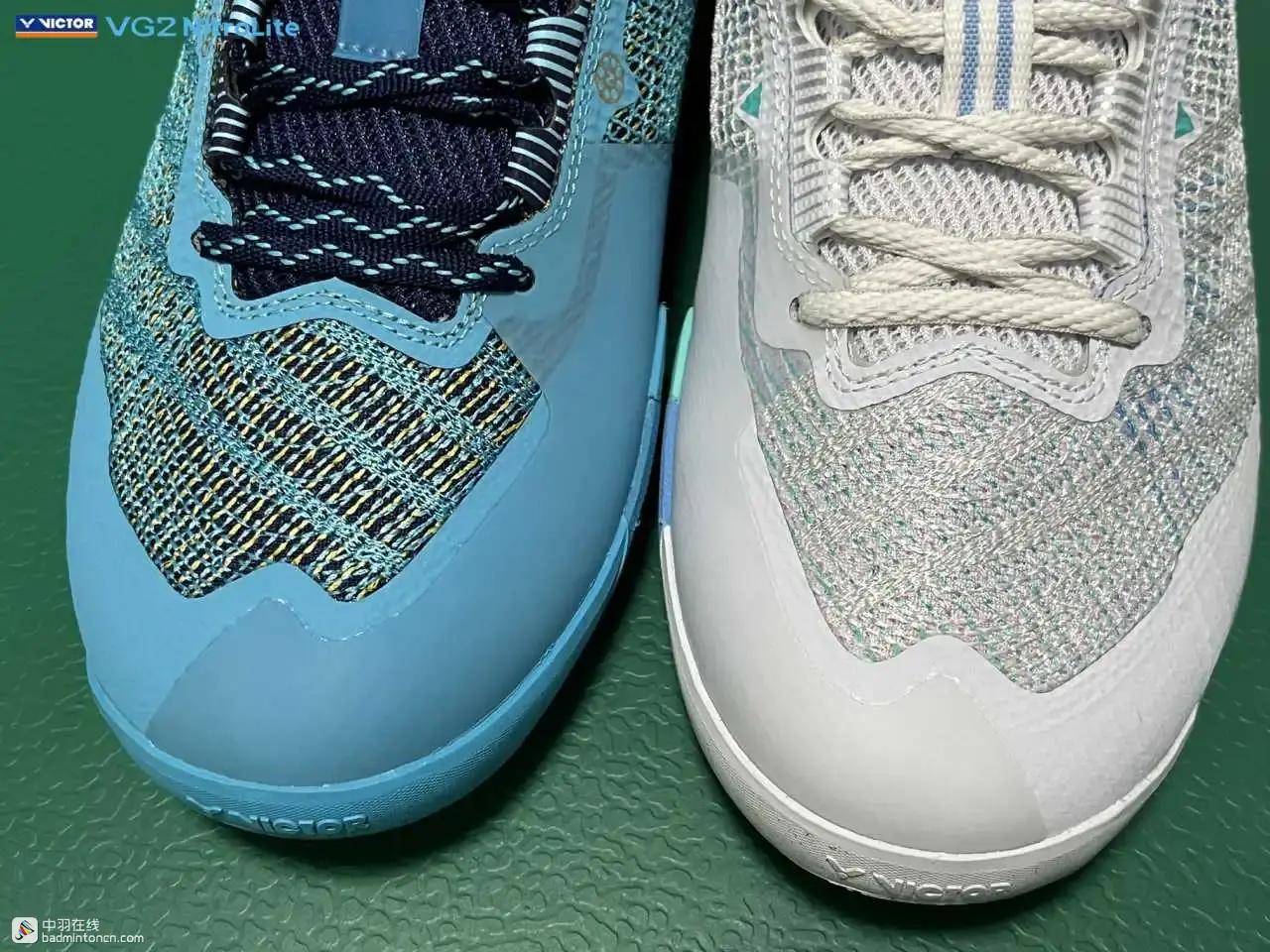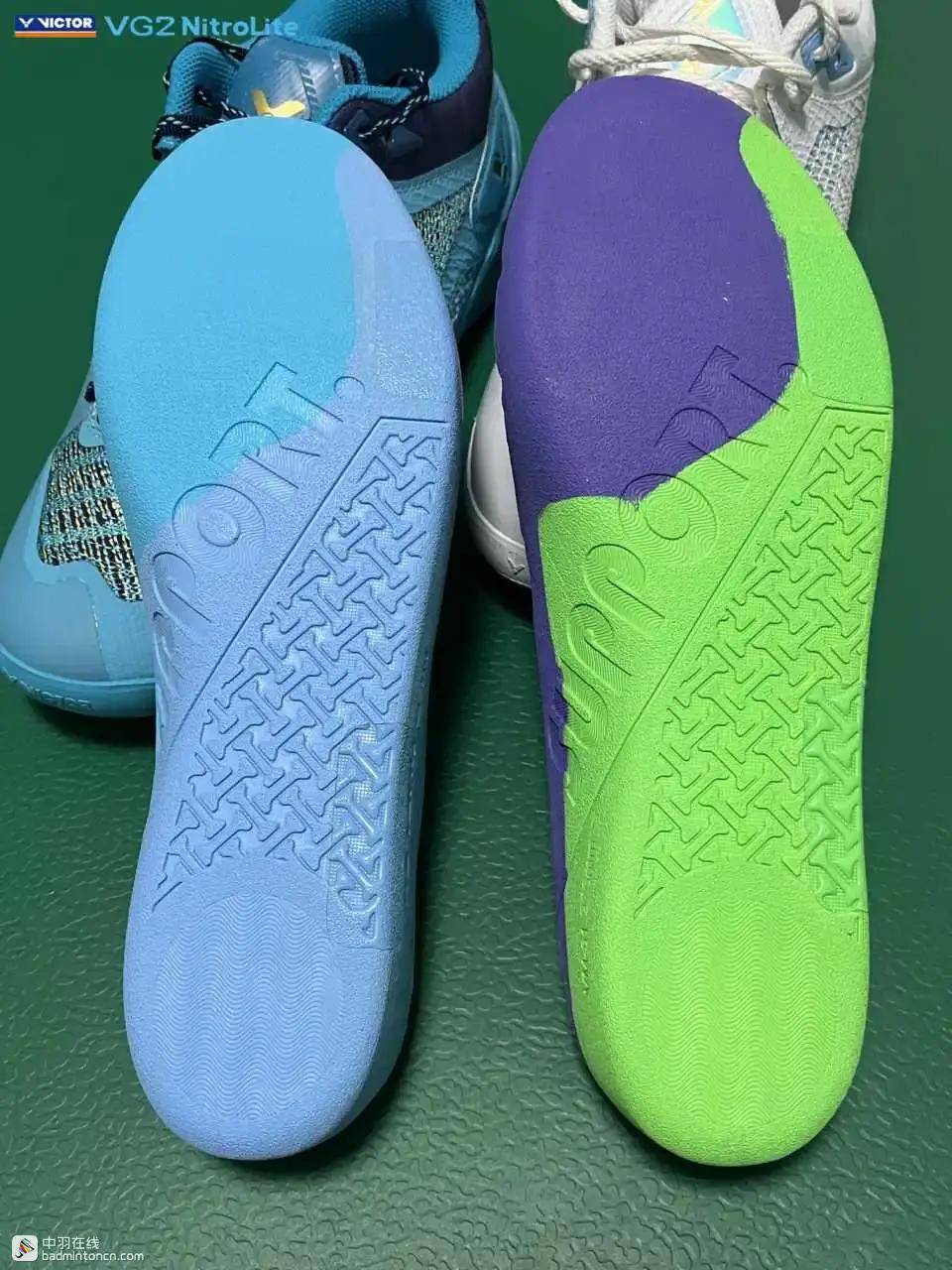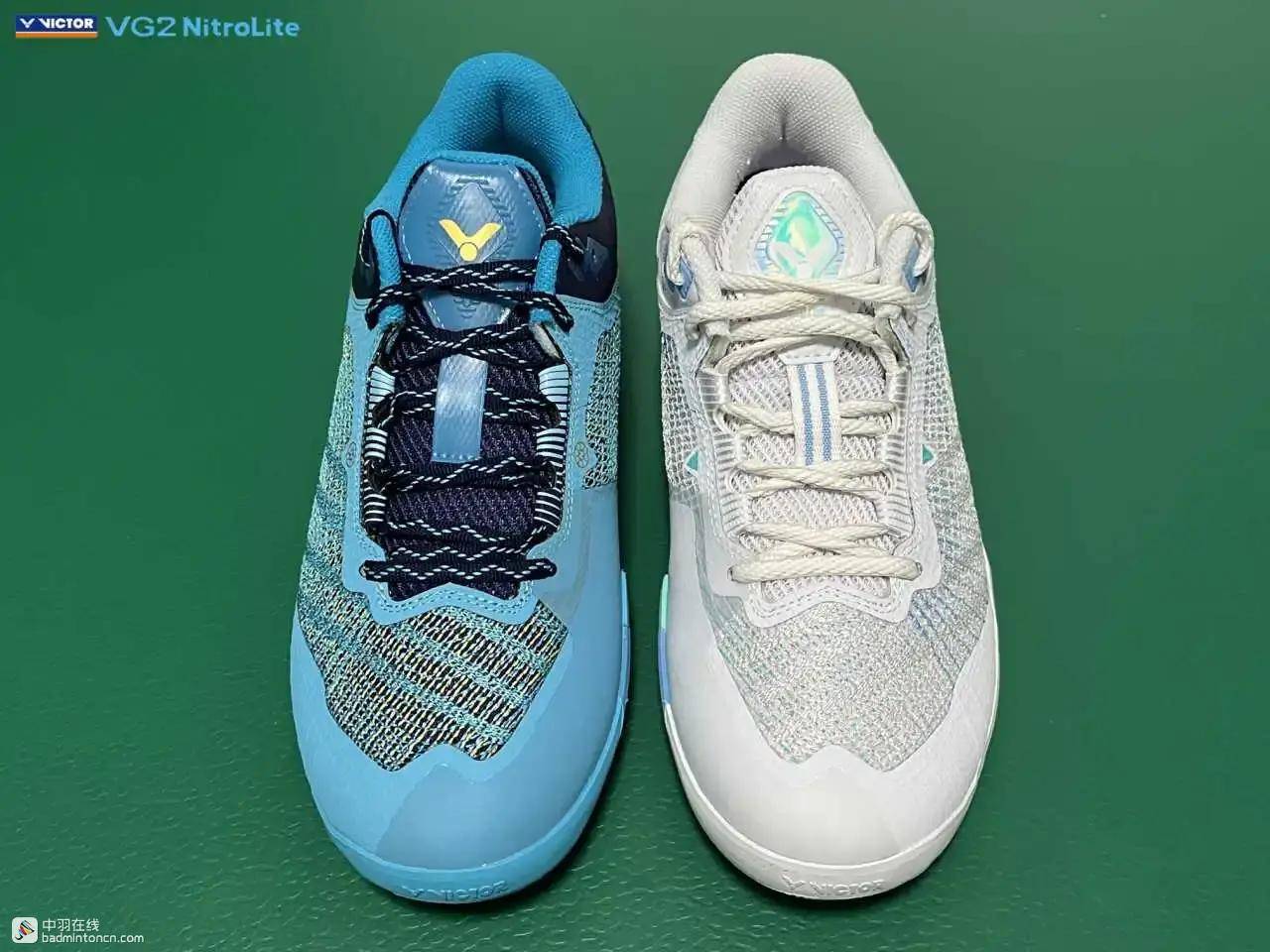 鞋内侧下方的型号名称以蓝金搭配来区分“VG2”和“NitroLite”,且左右脚的颜色是交错的,金对蓝,蓝对金。