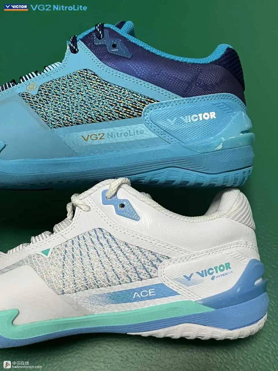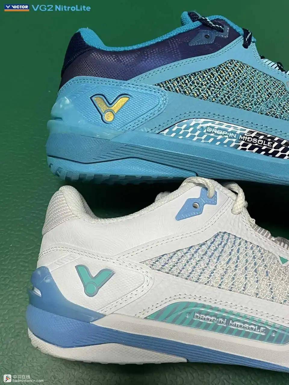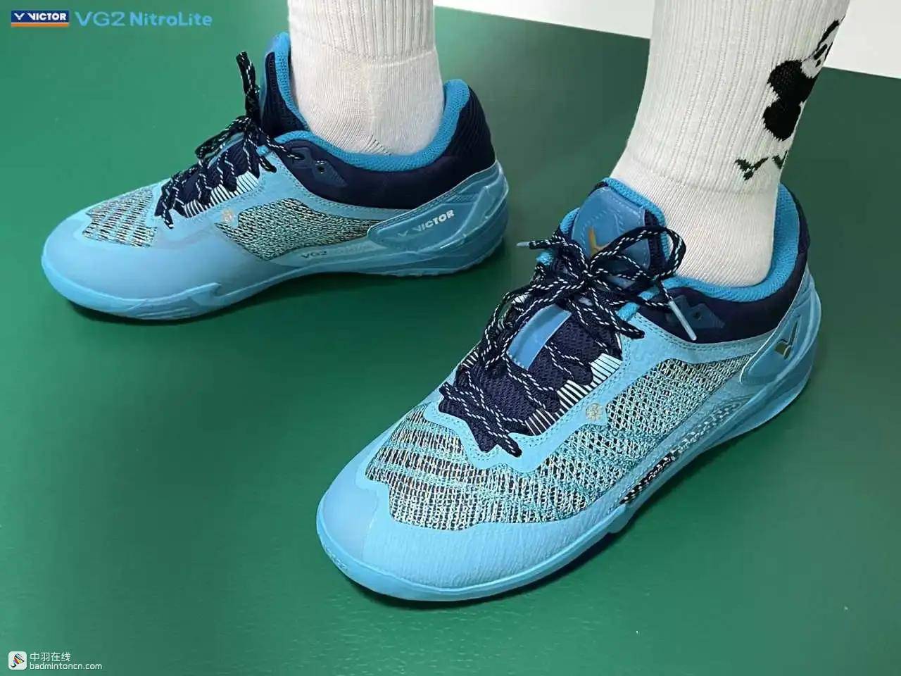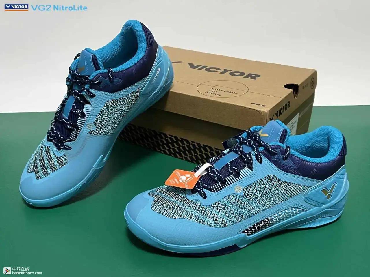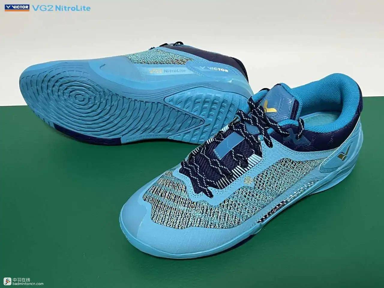 鞋内侧下方的型号名称以蓝金搭配来区分“VG2”和“NitroLite”,且左右脚的颜色是交错的,金对蓝,蓝对金。