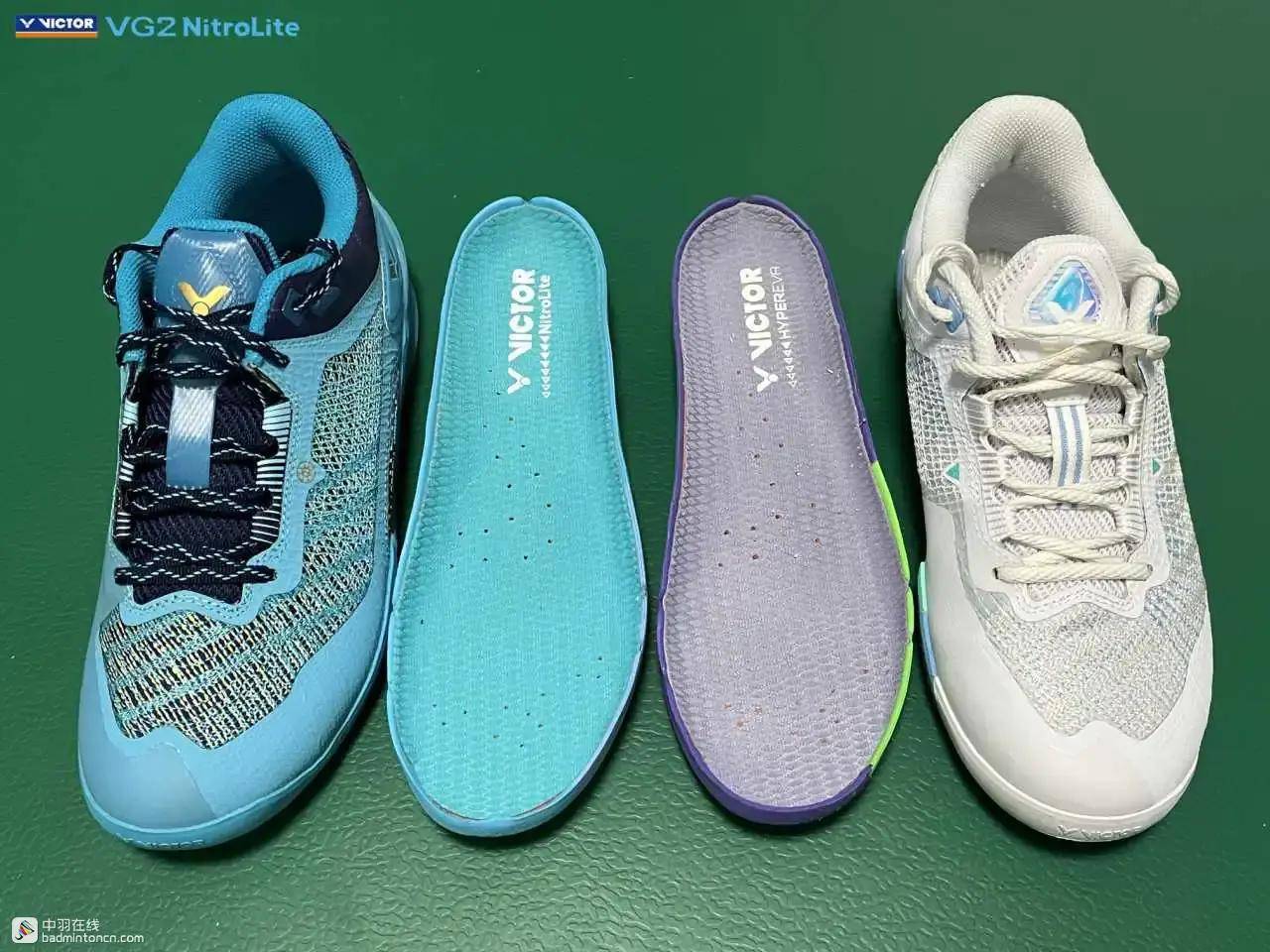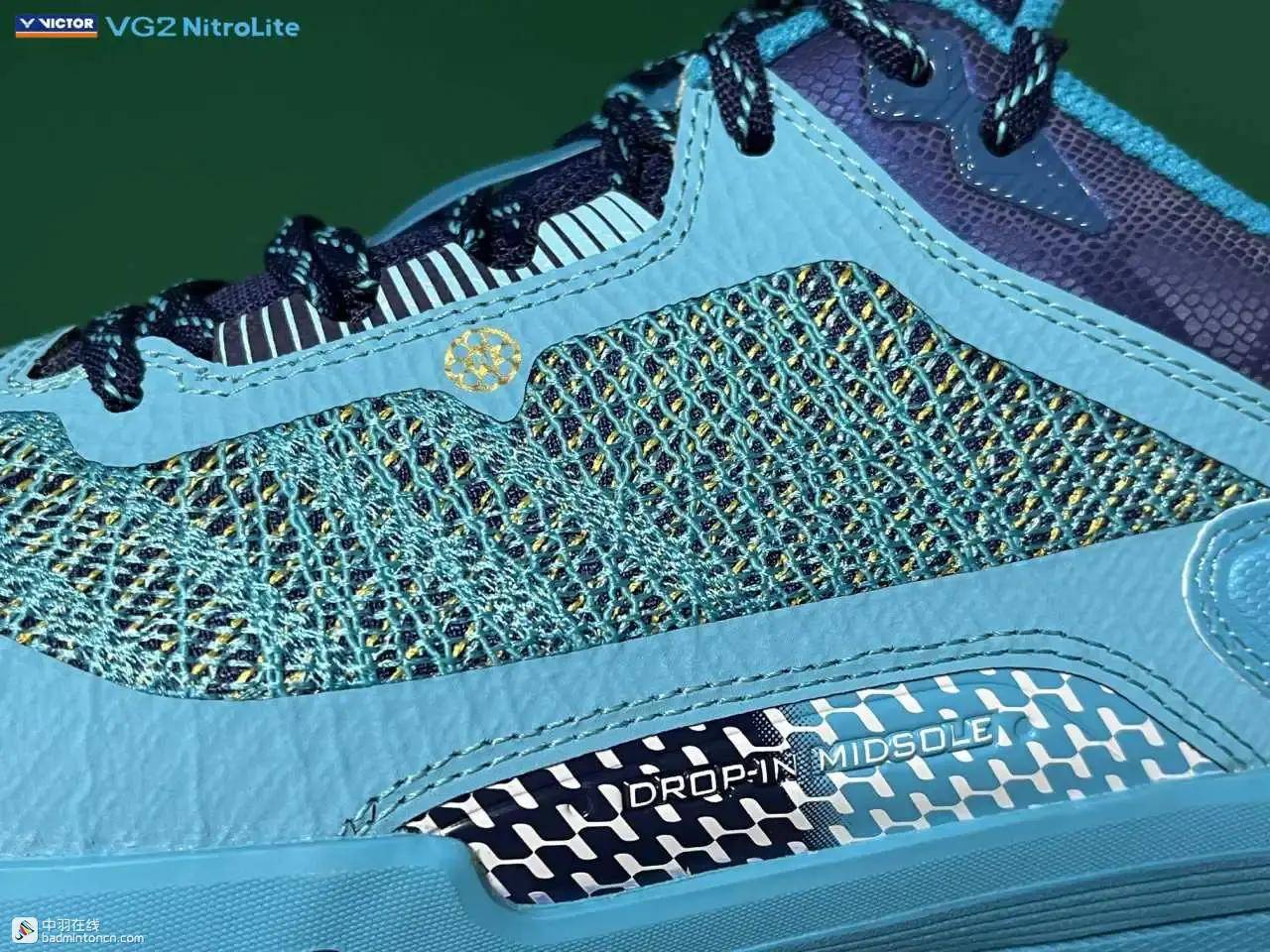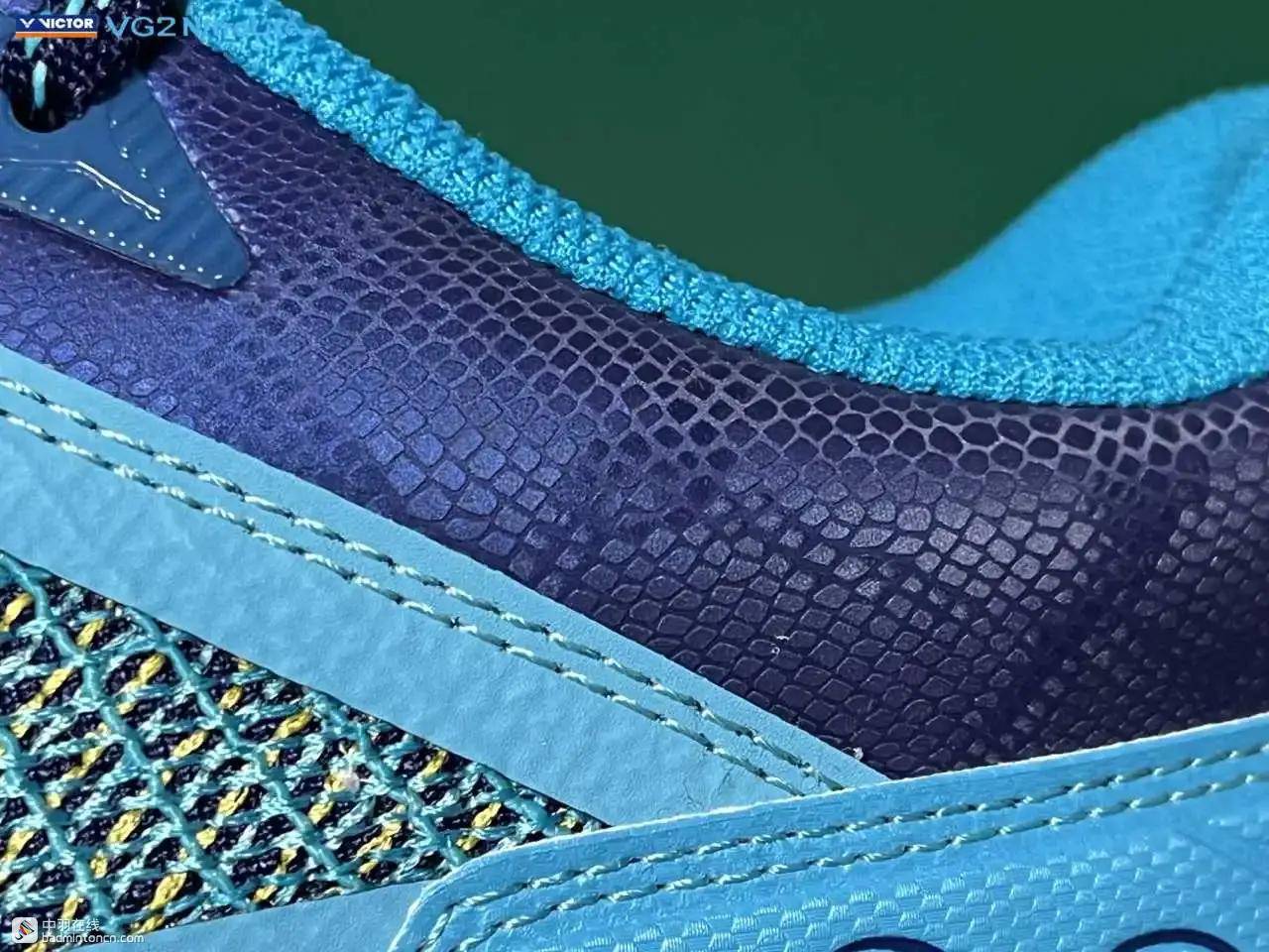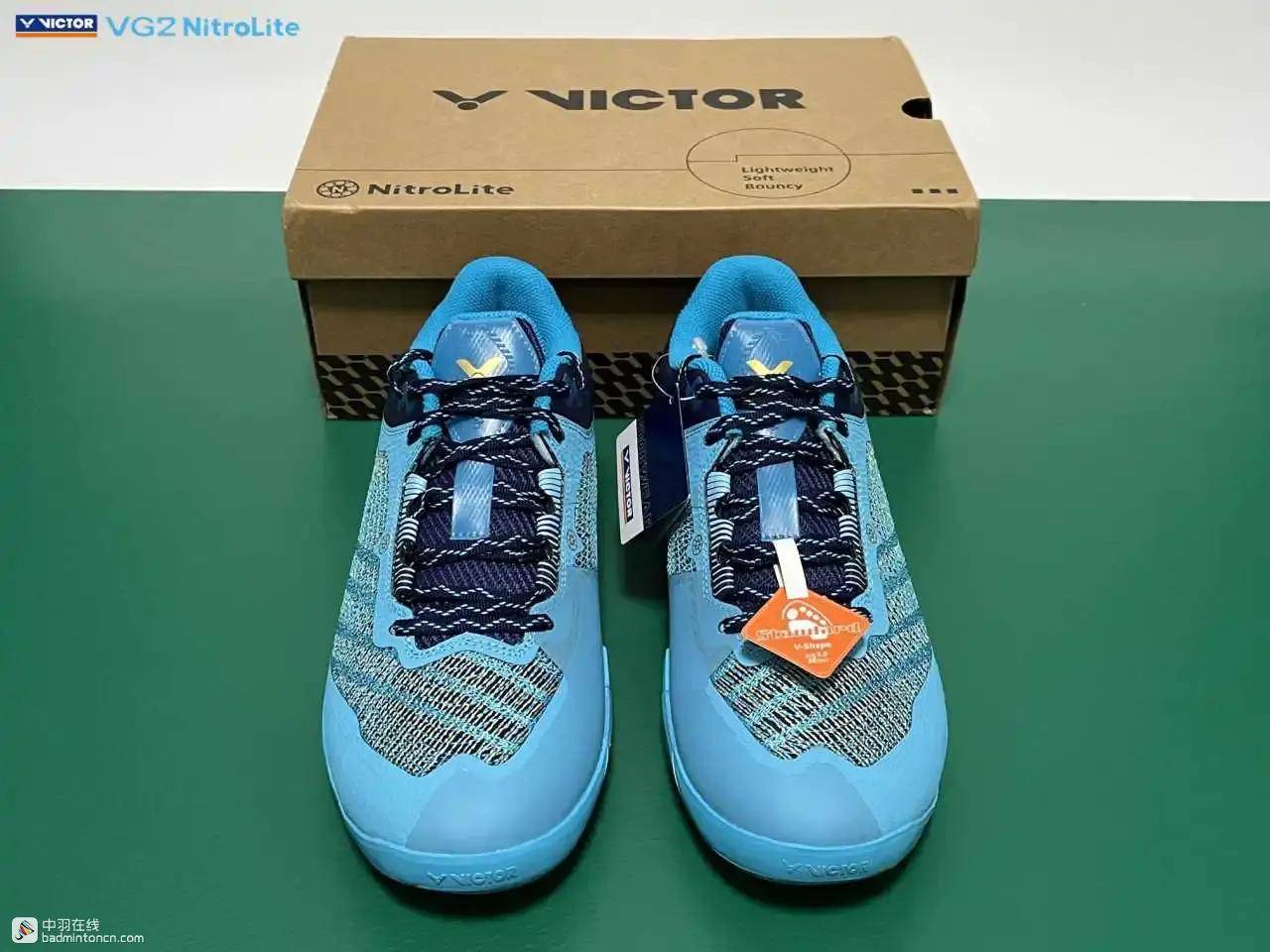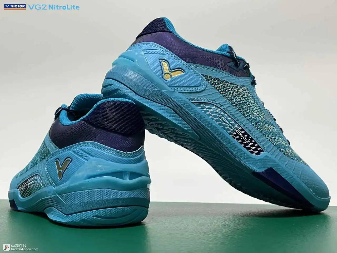 鞋内侧下方的型号名称以蓝金搭配来区分“VG2”和“NitroLite”,且左右脚的颜色是交错的,金对蓝,蓝对金。