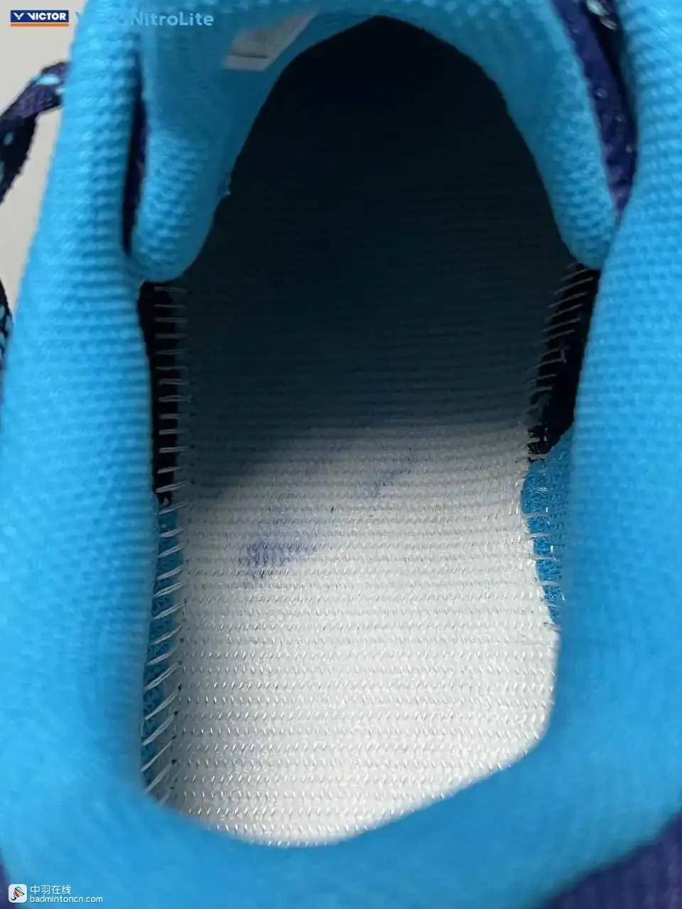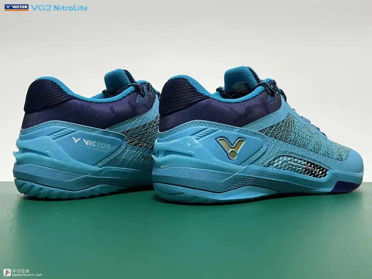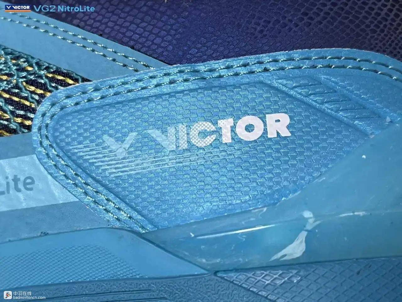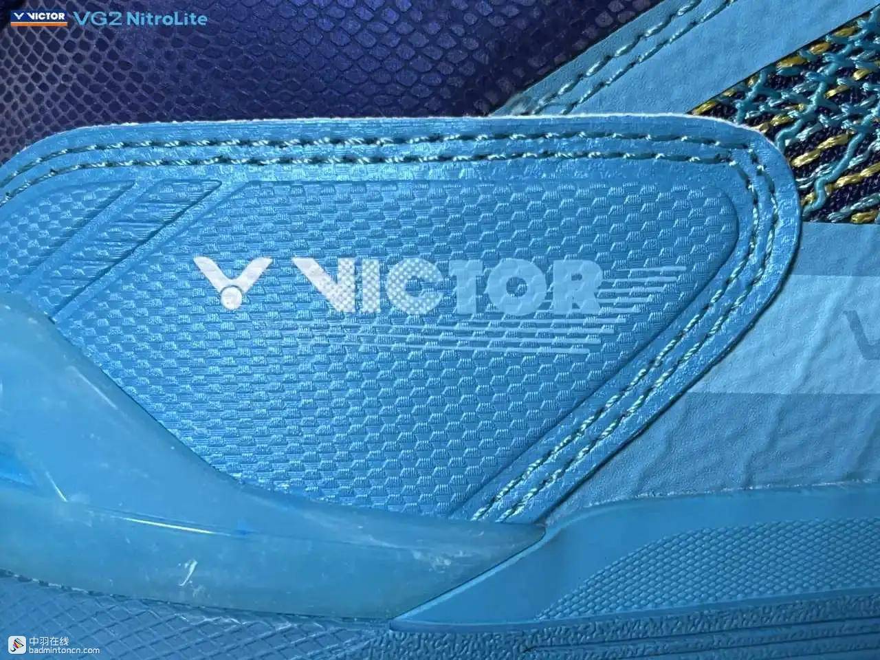后跟内侧对应位置印着的则是由浅蓝向白色渐变的威克多LOGO与品牌名称。
