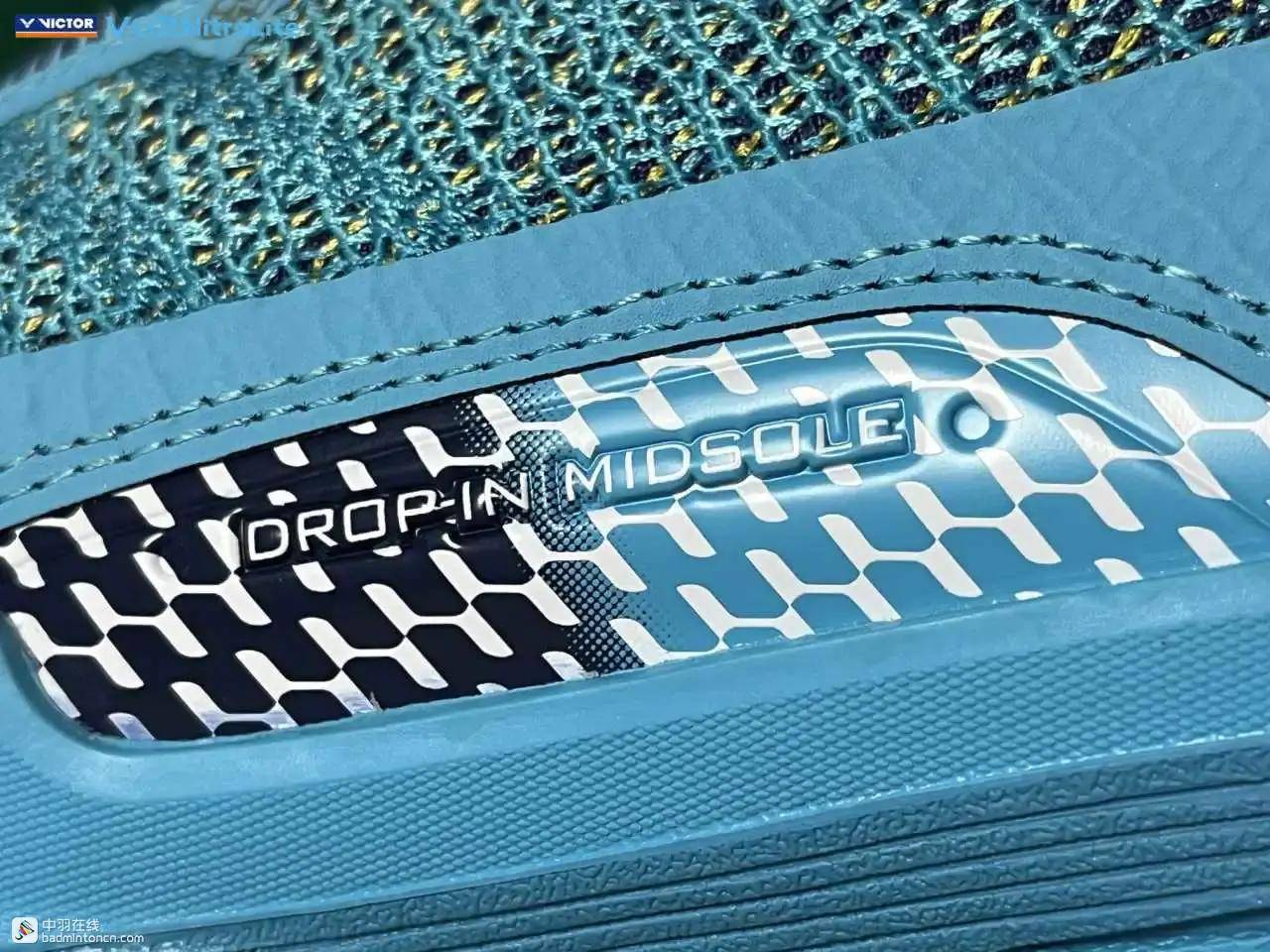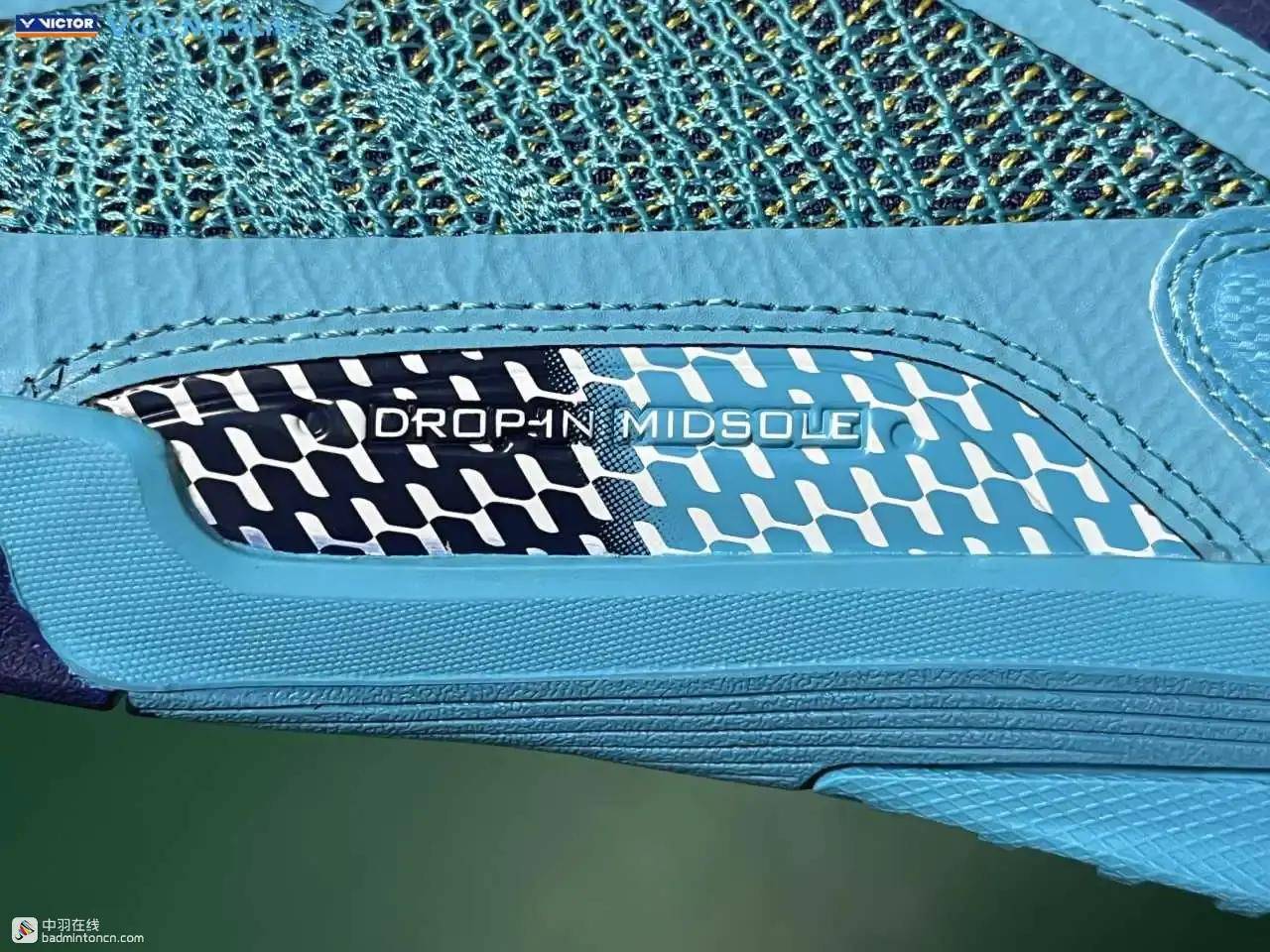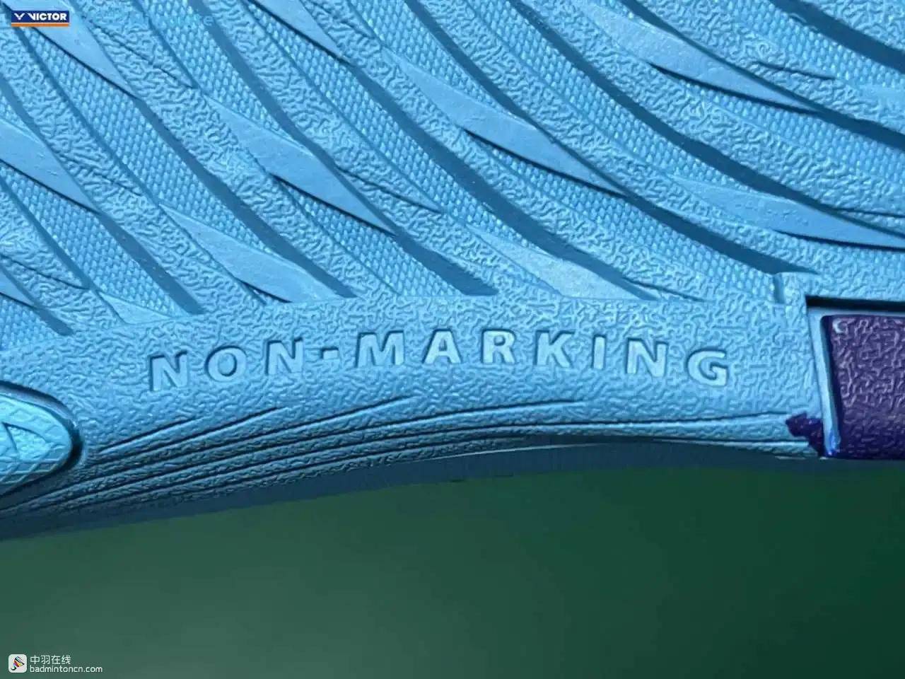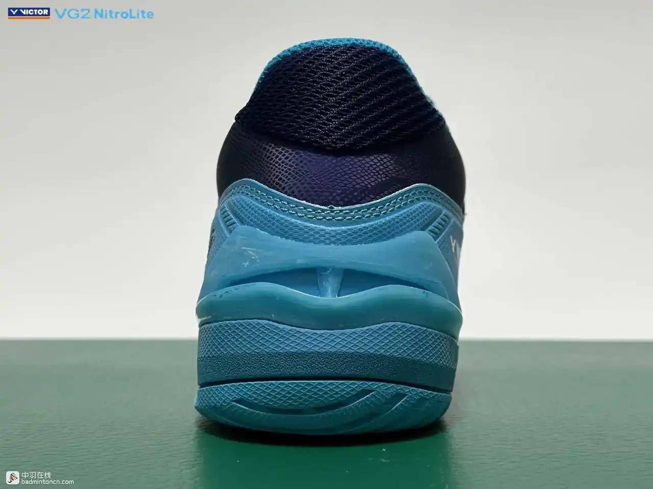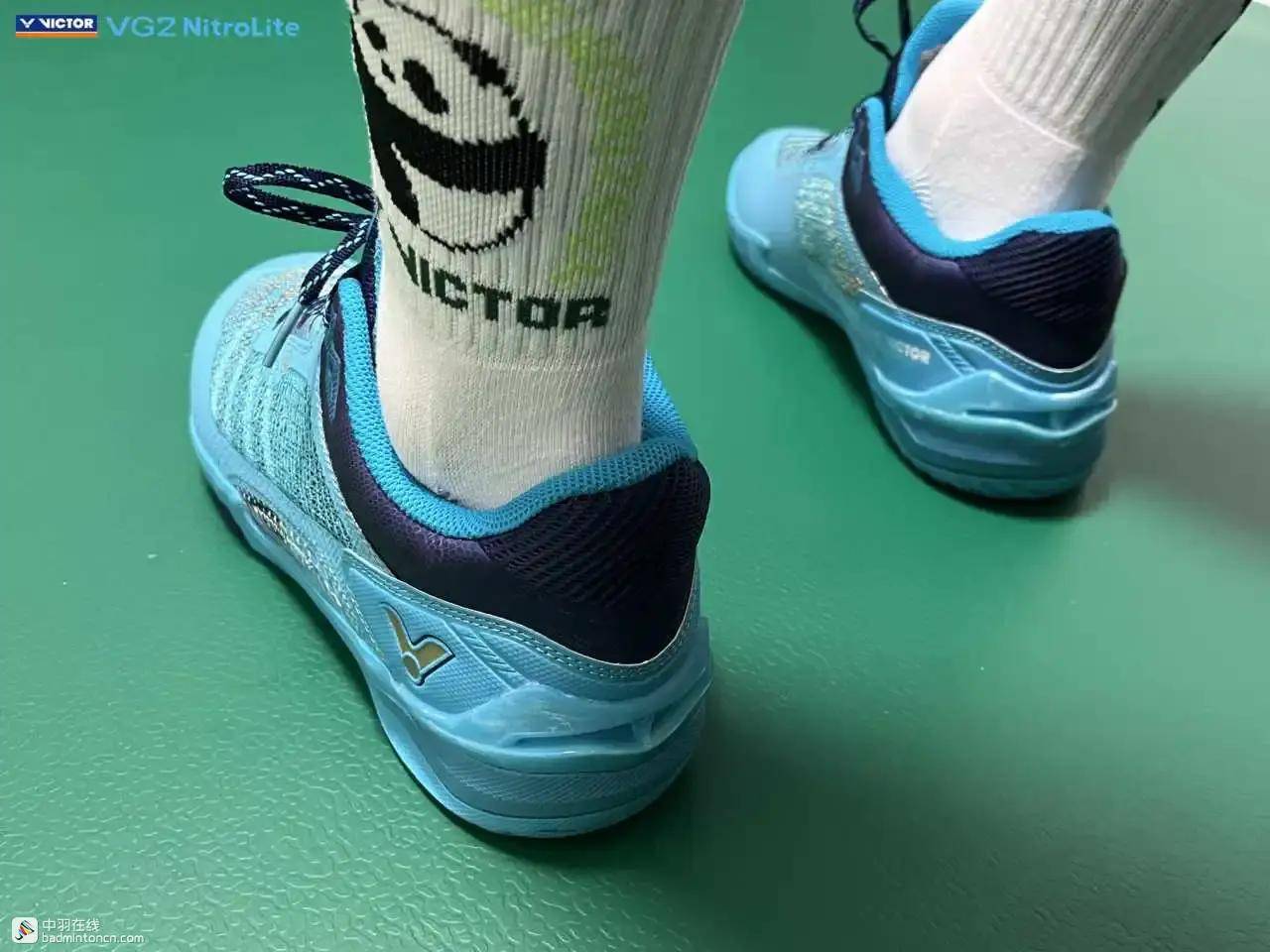 后跟内侧对应位置印着的则是由浅蓝向白色渐变的威克多LOGO与品牌名称。