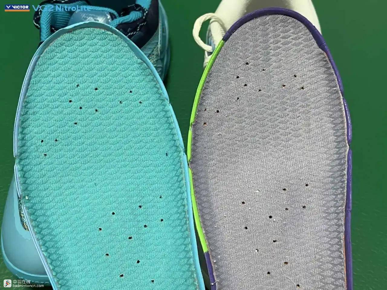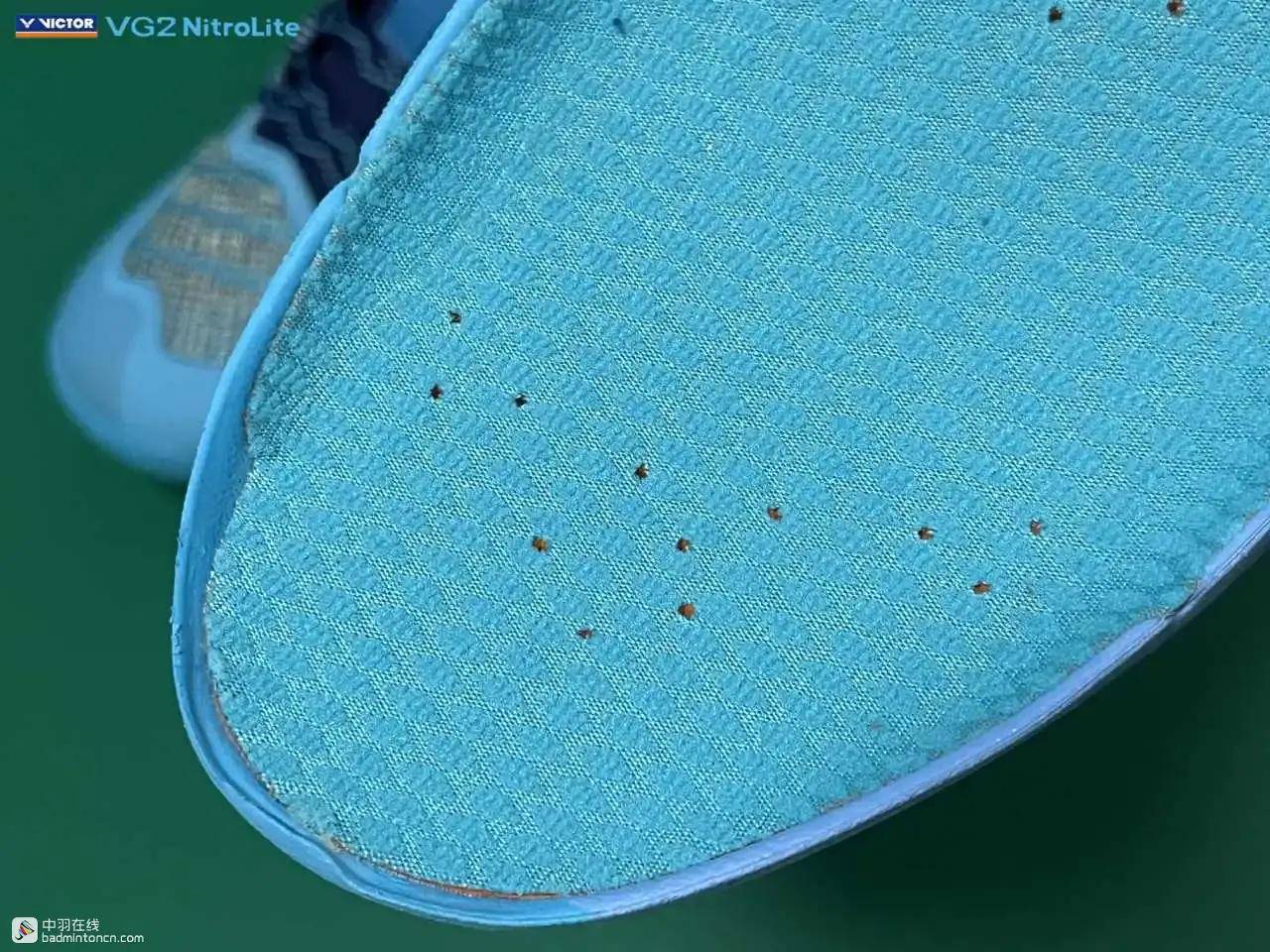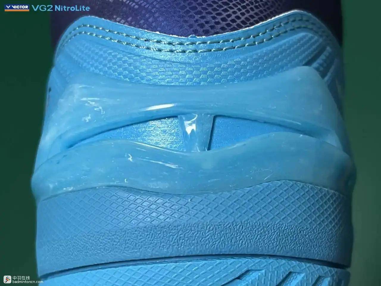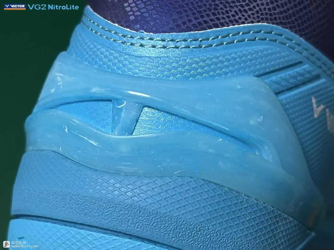 但对于后场的一些涉及到起跳和转体的激烈步伐,VG2 NitroLite的内部结构设计还是会显现出一定的局限性,举个例子,在单打中进行头顶突击时,不论是转身的马来步,还是不转身直接起跳的中国跳,在击完球后,非持拍手一侧的前脚掌落地时,不仅要承受一个纵向的冲击,还要通过这个蹬地让身体回动,因此应该也会产生一个扭转的过程,此时如果这个扭转的力很大而且很突然,就会感觉到鞋的内置中底边缘和鞋面之间的贴合不够稳固,出现脚踩到边缘的问题。