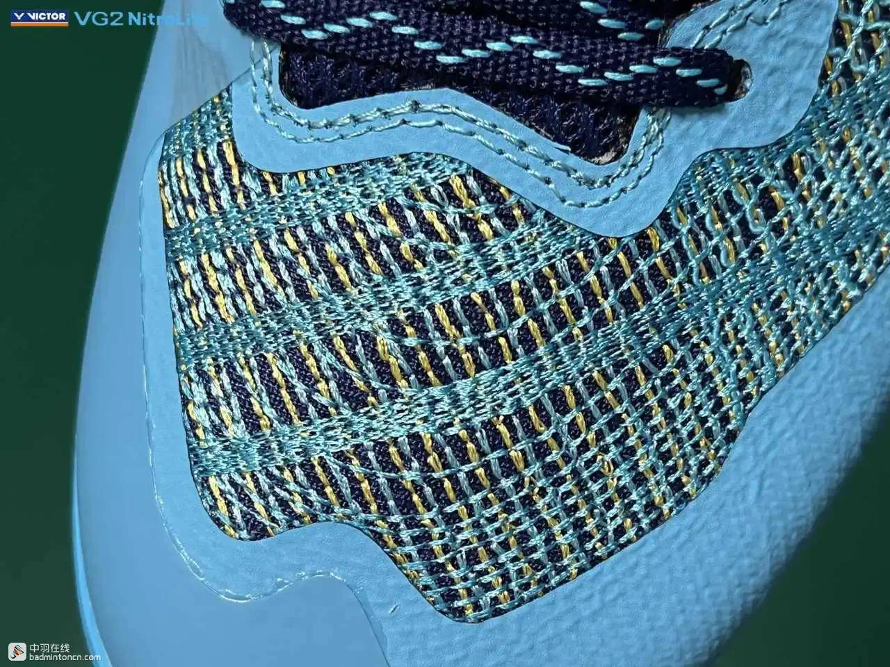 VG2 NitroLite的鞋面大面积采用了绳绣工艺,不同粗细、四散分布的水蓝色、深蓝色和金色绳线相互交错,令人眼花缭乱。
