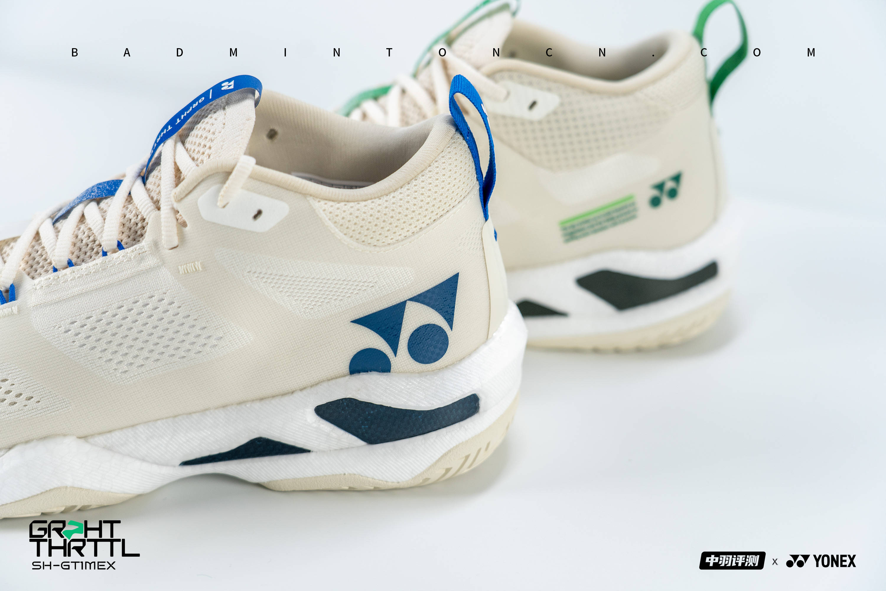Grpht Thrttl整体鞋身为复古风格的米白色,图案的运用方面较为简洁,醒目YONEX的logo以及几行小字做点缀,配色方面采用YONEX经典的蓝绿鸳鸯搭配左右脚区分,在鞋舌和后跟提环位置也做了同样的处理。