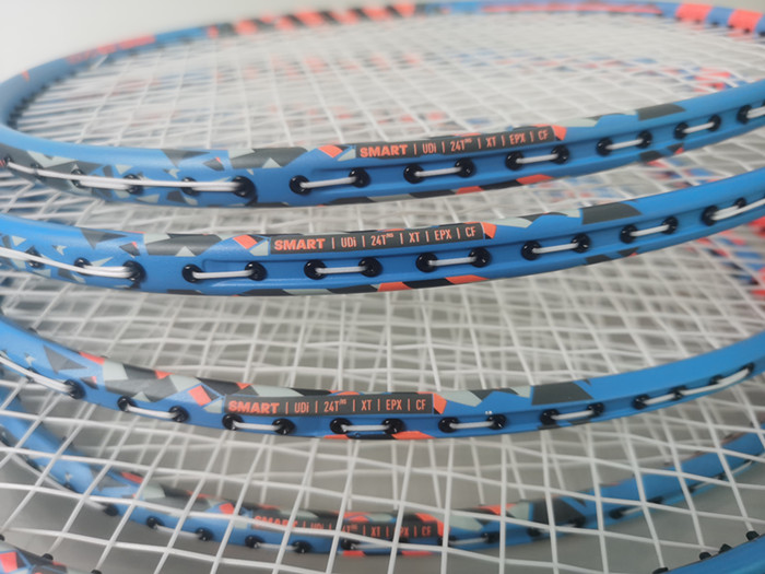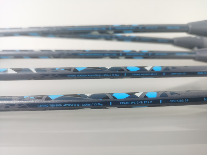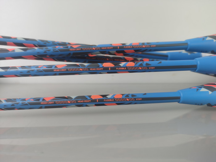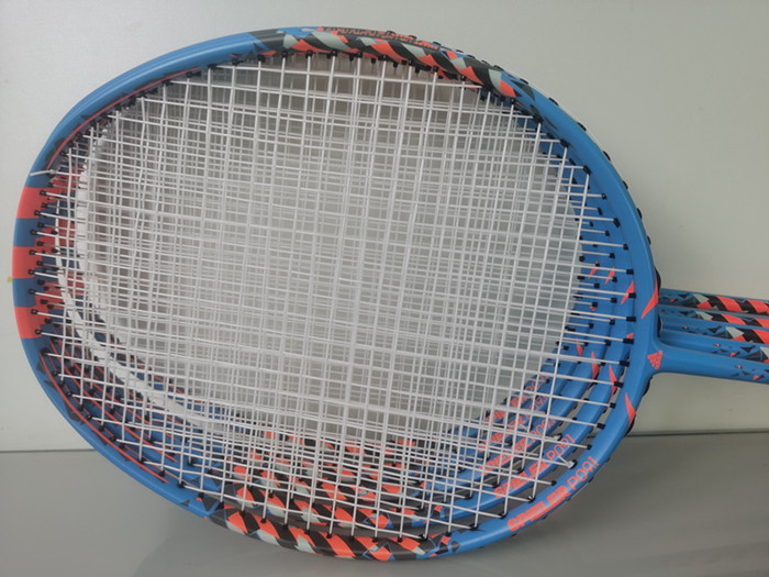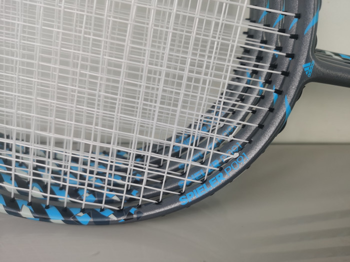 阿迪达斯F09蓝:拍长675mm,平衡点297mm,72孔,5UG5,抗拉力30磅,球拍送线送手胶.拍框材质:高刚性碳纤维。中杆材质:高刚性碳纤维+纳米树脂  破风框
