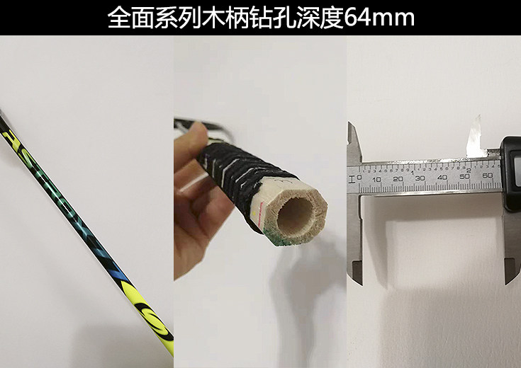其实羽毛球拍的木柄后面都是中空的。传统球拍在生产过程中,通过使用不同钻孔深度的木柄在调节重量和平衡点的(如下图)